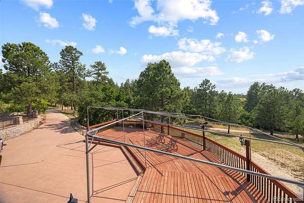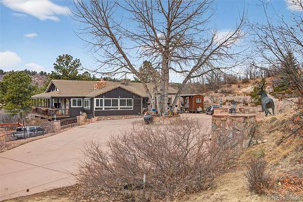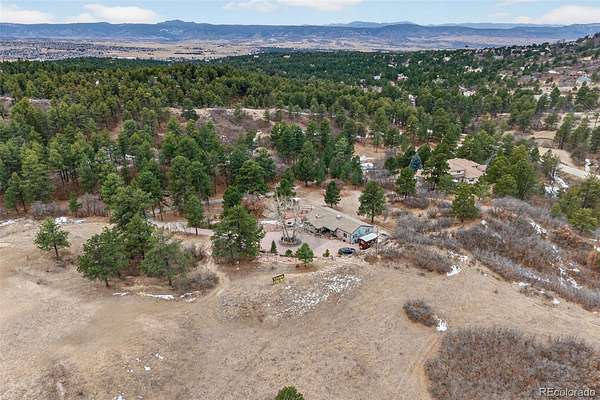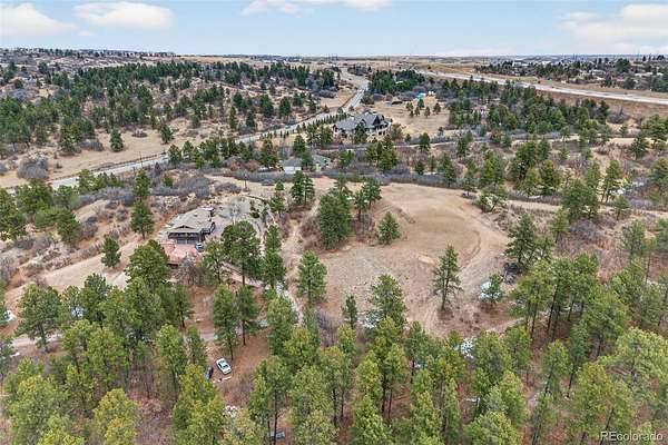 A rare and remarkable offering in the prestigious Castle Pines/Happy Canyon corridor. Huge plus, this is not a part of the Castle Pines HOA, so an ADU can be built! This 5.37-acre estate property presents a once-in-a-lifetime opportunity to build your legacy. Surrounded by over 100 acres of protected open space and mature ponderosa pines, the setting is both breathtaking and private, offering unobstructed Front Range views and an unmatched sense of serenity. No HOA, lower taxes, and the ability to walk to the PGA events at the golf courses golf course at Castle Pines elevate its appeal even further. This site allows for two homes, your forever home and guest home. Unlike most lots this one has gentle slopes giving you options on where you'd like to build your forever home/ guest home/ collector garage/ equestrian barn (a total of three building structures are allowed on the property). Including a 360 degree view at the top of the property! This is the final 5+ acre parcel available in this coveted enclave, an extraordinary chance to create something truly exceptional. Over $1M in site improvements already completed. Wildlife, views, and absolute privacy just minutes to I-25, shopping, dining, and top-tier schools. The property includes a beautifully updated 2-bedroom, 1.5-bath guest house featuring an oversized garage, expansive wrap around deck, paved drive, and elevated finishes throughout. With a private well, septic system, and natural gas already in place, the home is fully functional as-is while you design and build your forever estate.