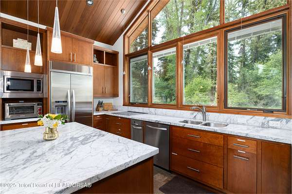 This property is a Jackson Hole 5.15 acres retreat in the coveted Solitude subdivision with main house, guest house, barn, and Snake River access. The 3,473 sq.ft. main home, fully remodeled in 2025, features vaulted ceilings, expansive windows showcasing panoramic views of Sheep Mountain, Jackson Peak, and Snow King. The 3-bed, 3-bath layout includes an office and a sun-drenched south-facing deck, perfect for outdoor dining or evening relaxation. A separate guest house, a rare feature in this area, is privately situated on the lower portion of the property and connected via a private trail or secondary driveway, provides a peaceful stay for visitors. The custom-built 2,500 sqft. barn includes a heated workshop and versatile space for creative studios, offices, and recreational storage. Enjoy private community access to the Snake River, ideal for fishing, kayaking, or peaceful walks along the levee. Set in a horse-friendly community with plenty of space to ride or roam, along with open views, and mature trees, this property offers a flexible layout for a range of lifestyles. Bordering a protected wildlife corridor, the setting offers serene encounters with native wildlife, open skies, and a true sense of the West. A rare blend of privacy, modern design, and raw natural beauty - this is Jackson living at its finest.