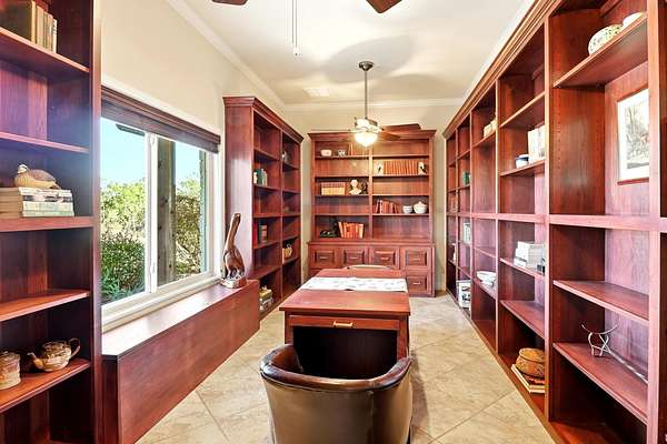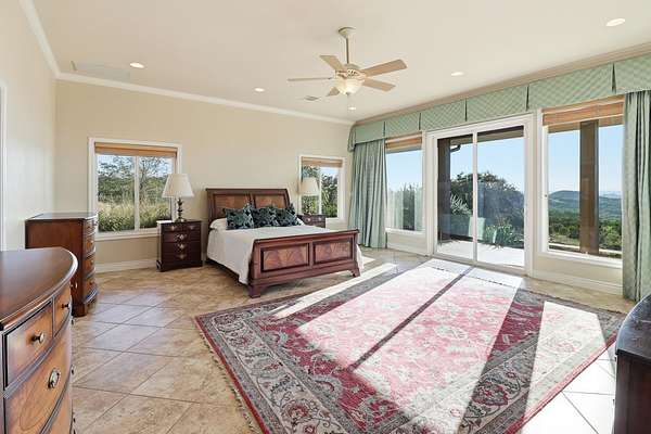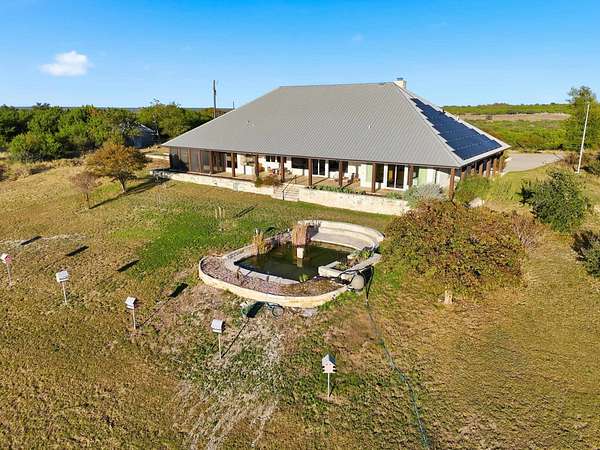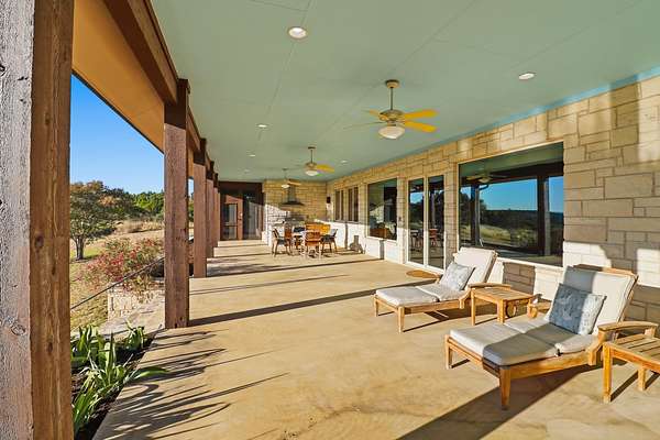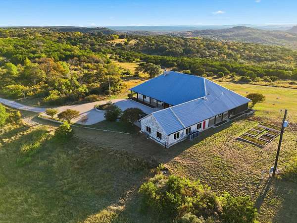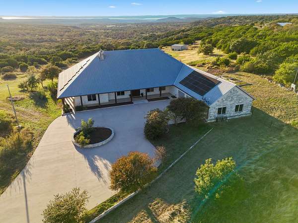 Immaculate custom stone home on 30 acres of Texas Hill Country beauty with stunning Lake Buchanan views! Built by Tommy Long, this one-level home offers a soaring great room with a massive stone fireplace, open dining, and a wall of windows that invite the outdoors in. The chef's kitchen features a large island with prep sink, double ovens, warming drawer, microwave, cooktop, and a walk-in pantry that doubles as a safe room. Primary suite offers patio access, spa bath with soaking tub, dual vanities, walk-in shower, and huge custom closet with built-in island. Private office/library with built-ins, split plan with guest bedrooms and porches, powder room, and generous laundry with sink and storage. 3-car garage with solar panels for efficiency. Outdoors: raised stone garden beds, rainwater system, stocked koi pond, wraparound porches, and 1,200 sq ft metal building. Peaceful sunsets and panoramic Hill Country views complete this incredible property near Marble Falls & Burnet!