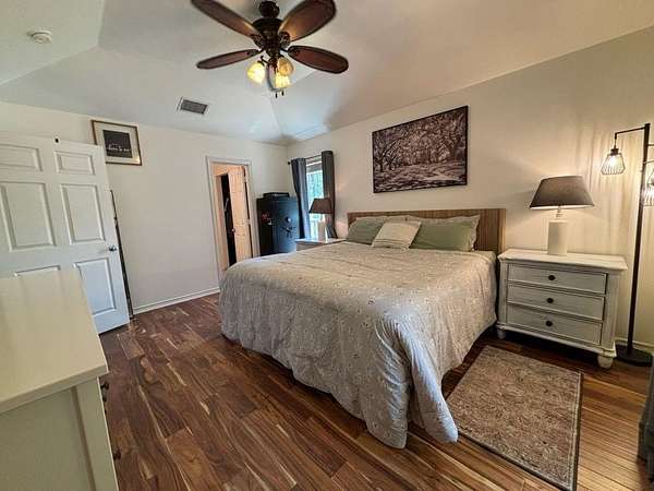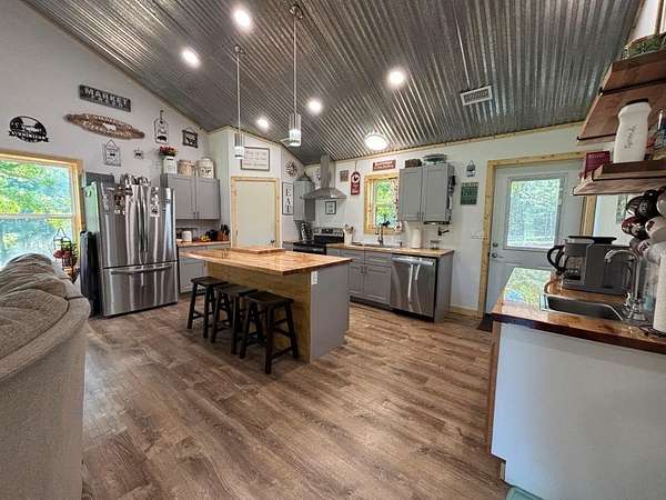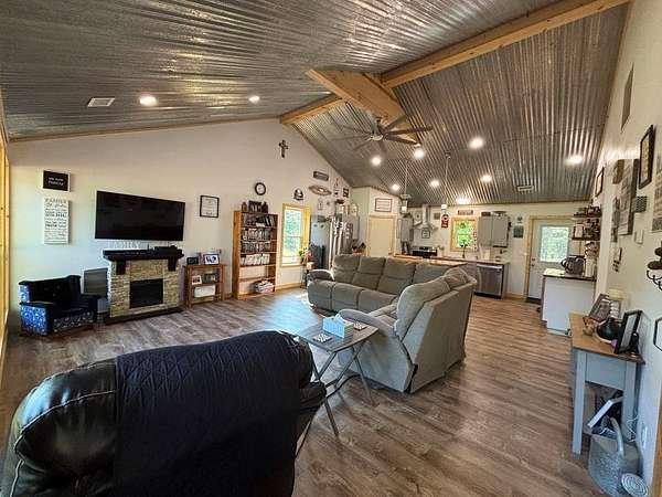 10-acre hilled property includes two homes with separate access, 900 sq ft shop, and various additional features. The main home is 2,000 sq ft with 3 bed, 2.5 bath, office, renovated kitchen with granite counters, recent HVAC, tankless water heater, recent flooring, and paint. The second home, 1,500 sq ft, has 2 bed, 2 bath, an oversized pantry, attached 720 sq ft garage, 20-ft ceilings, a large open living area, butcher block counters, and a 5x5 tile shower. Both homes have their own automatic gates and fencing. Includes pond, animal pens, chicken coop, garden area, storm bunker, 2 additional sheds w- concrete flooring. Each home is on septic, with a shared well. The 900 sq ft shop has full bath-kitchen-laundry hookup.