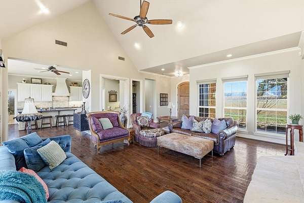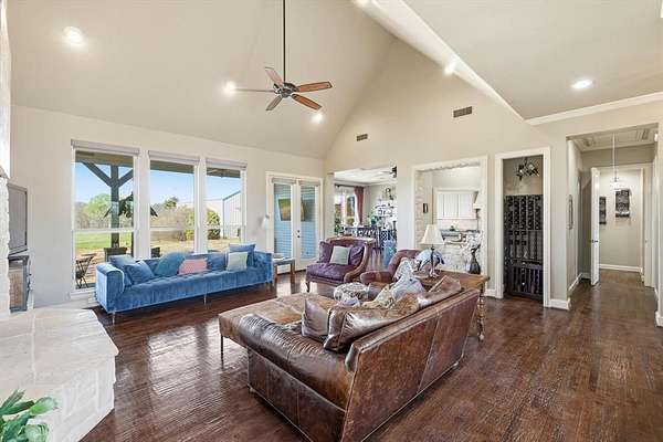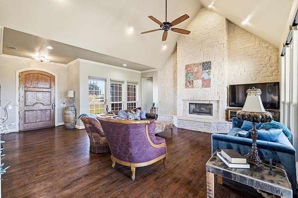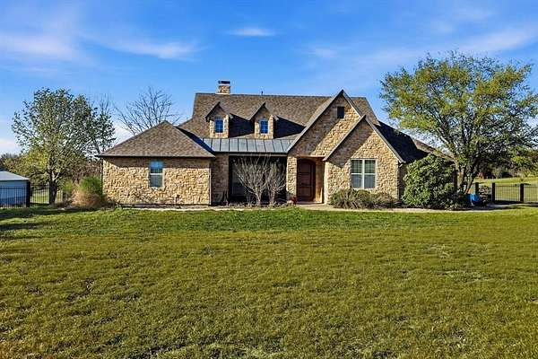 The home showcases warm stone and wood finishes that create a timeless, inviting feel throughout. Inside, you’ll find spacious living areas designed for both everyday comfort and entertaining. Large windows bring in natural light and provide scenic views of the surrounding acreage.