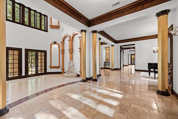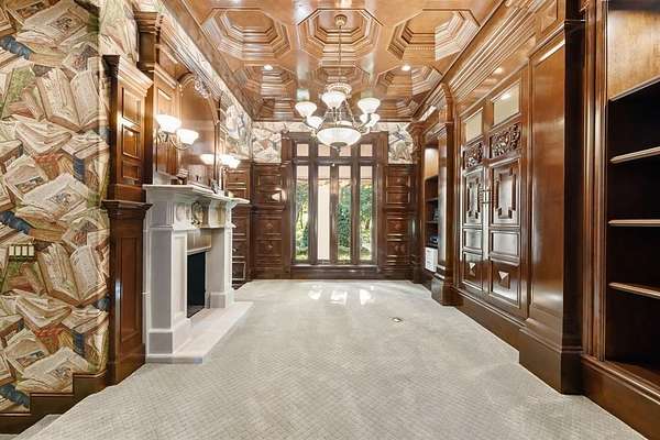 Inside, soaring cathedral ceilings with carved wood beams, oversized windows and abundant natural light create a grand yet inviting atmosphere. The primary suite is a serene retreat with dual over sized closets, dual vanities, fireplace, terrace, a private exercise room, and breathtaking views of the manicured grounds. A private guest suite with exterior access ensures comfort and privacy for visitors.