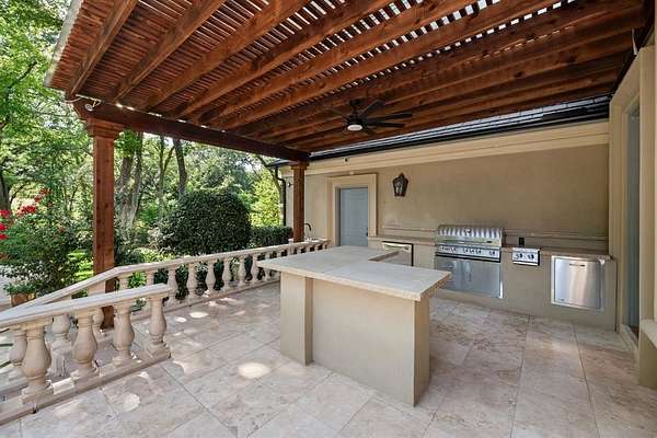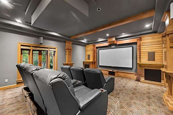 Designed for elevated living and entertaining, the home features a gourmet kitchen, multiple elegant terraces, a balcony overlooking the lush landscape, and an expansive outdoor area featuring a new kitchen with bbq grill, sink, pergola, infinity-edge pool, spa, and sunken fire pit. A dedicated theater room offers the ultimate cinematic experience adjacent to a game room with fireplace and bar.