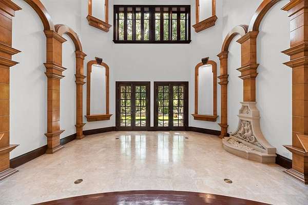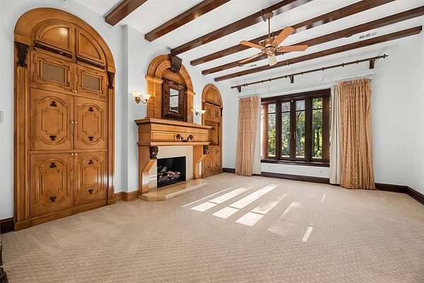 Inside, soaring cathedral ceilings with carved wood beams, oversized windows and abundant natural light create a grand yet inviting atmosphere. The primary suite is a serene retreat with dual over sized closets, dual vanities, fireplace, terrace, a private exercise room, and breathtaking views of the manicured grounds. A private guest suite with exterior access ensures comfort and privacy for visitors.