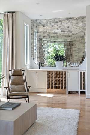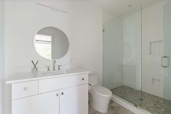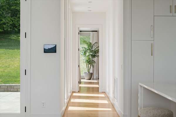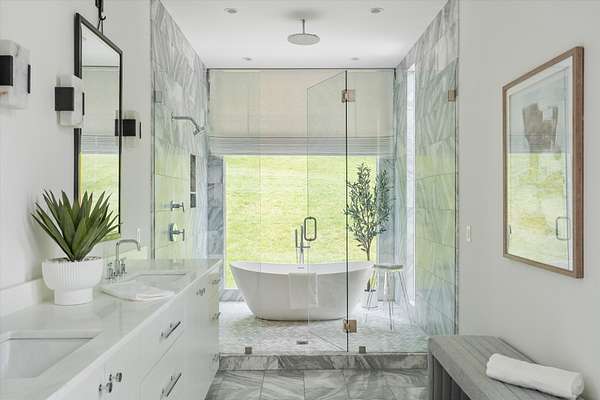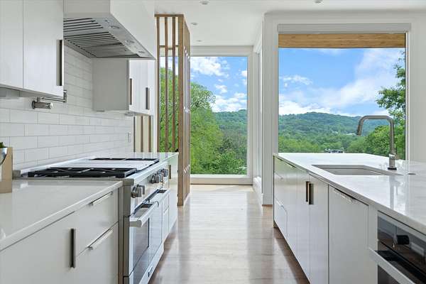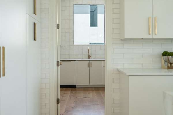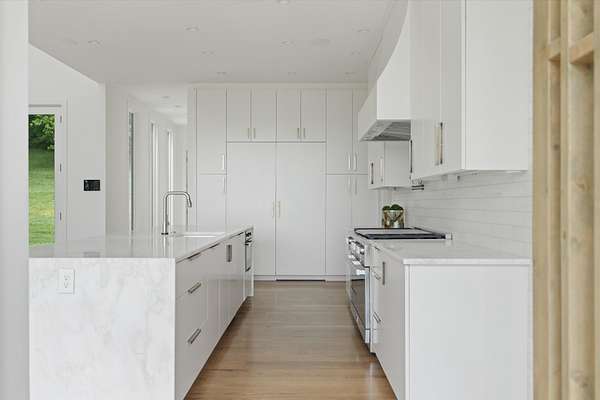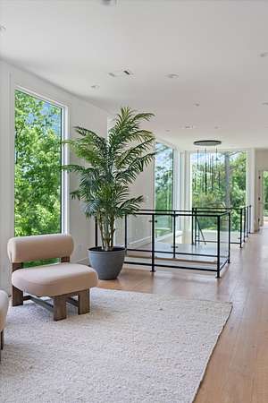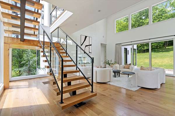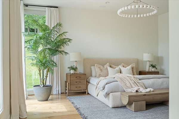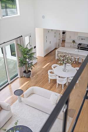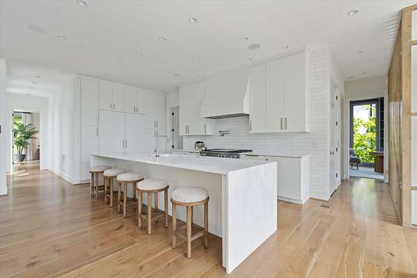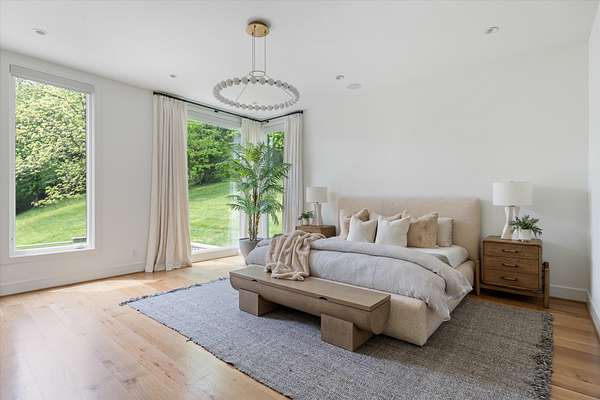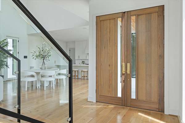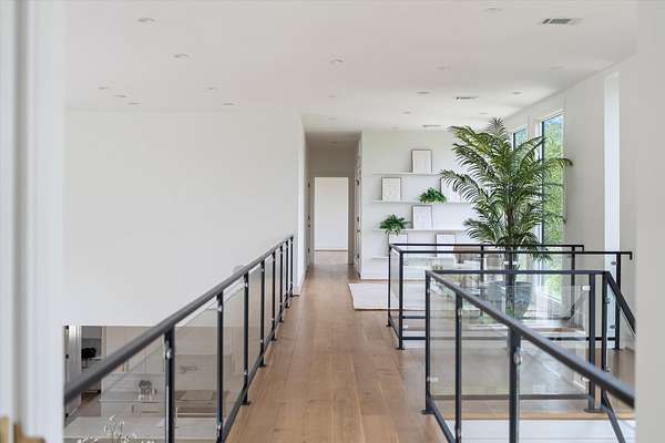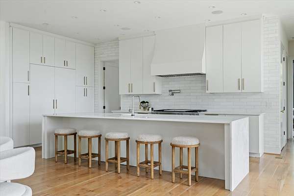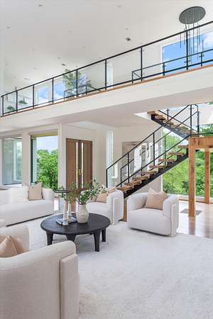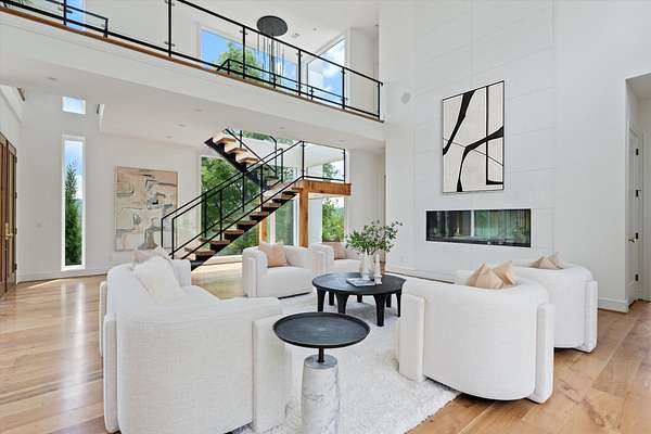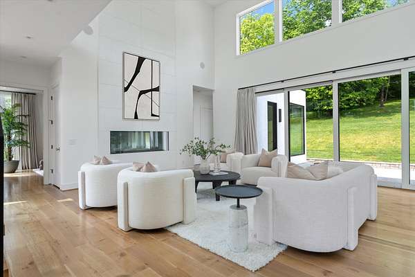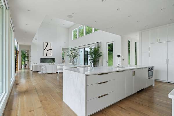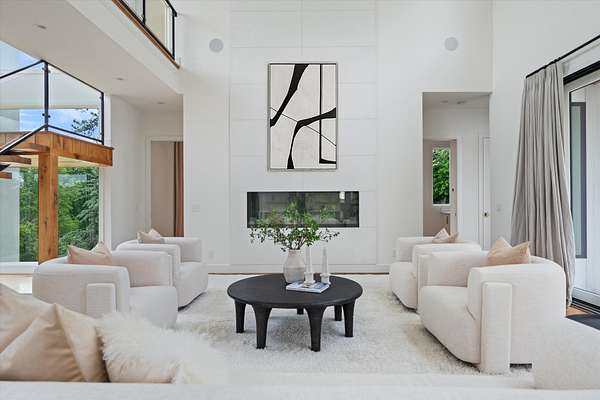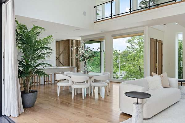 Inside, five spacious bedrooms and five-and-a-half baths are paired with dramatic ceiling heights and floor-to-ceiling glass that invites natural light into every corner. The open-concept living space centers around a chef's kitchen equipped with Sub-Zero appliances, a working pantry, and seamless access to the dining and lounge areas.