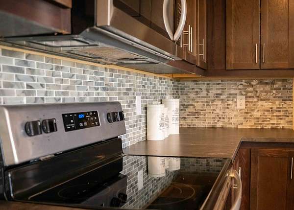 - A beautiful open concept kitchen with stainless steel appliances, dark cabinetry, crown molding, sheetrock walls, and tile backsplash.