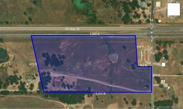 Long beautiful driveway to improvements on this property which includes absolutely stunning 17.18 acres of slightly rolling terrain with numerous elevated building sites surrounded by beautiful majestic oak trees for your new home place. The insulated 30x74 shop building is approx 2,220 sq ft and is situated toward SW corner of property. Bldg has mezzanine area for extra storage. Shop has 12 ft walls 10ft doors...plus 3 overhead doors. Electric service is thru OG&E with a 200 amp service and also has elec to the well as well as outside plug ins on the shop building. Additionally, property has spring fed pond, as well as newer fencing...mostly smooth wire and some barbed wire cross fencing, old corrals, good water well, small paddock. Located just outside city limits at corner of Midway Road and Hwy 70 West. Great location to bring a family...kids, livestock, business...perfect for all!! Located approx 20 to 30 minutes West from Ardmore and I-35...very convenient to shopping, lake country area, casinos, etc! Billboard and annual income from billboard can transfer with property if selling price is high enough.