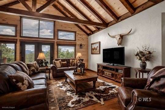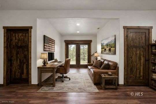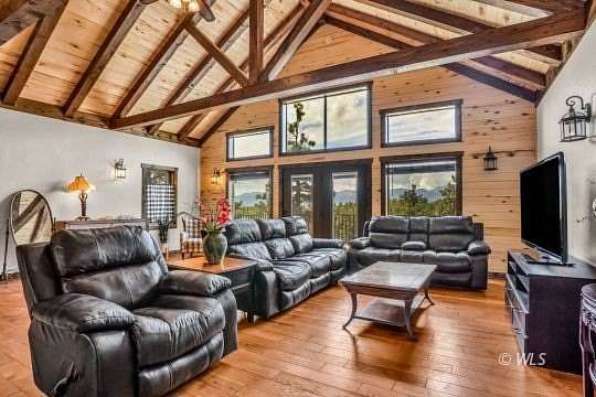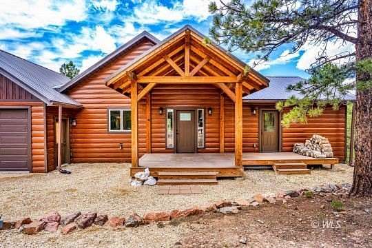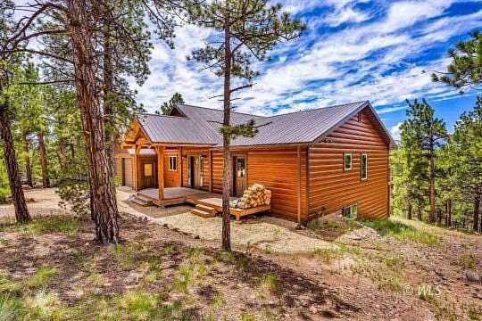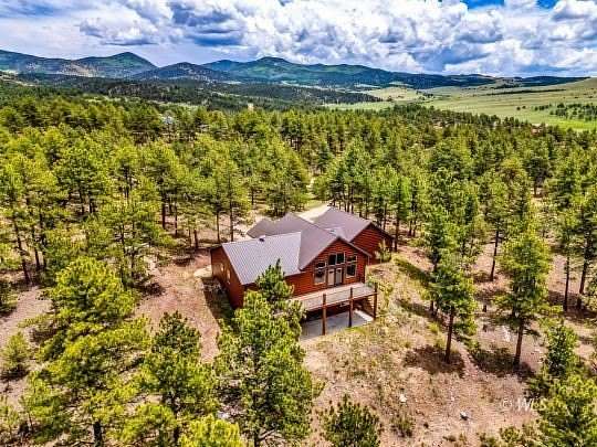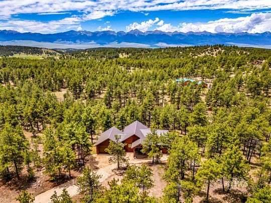 Welcome to your peaceful retreat in the desirable Eastcliffe Subdivision! This beautifully crafted 3-bedroom, 2.5-bath steel-sided home sits on 5.73 wooded acres and offers the perfect blend of comfort, elegance, and breathtaking scenery. Step inside to an open-concept living, kitchen, and dining area, highlighted by soaring cathedral ceilings and rich woodwork throughout. French doors in both the living room and the spacious primary suite lead to a large back deck, where you'll enjoy inspiring views of the Sangre de Cristo Mountains. The primary bedroom also features an ensuite bath for your convenience and comfort. The main level provides everything you need for easy living, including a laundry area and access to the attached two-car garage. The fully finished walk-out basement expands your living space with a generous recreation room or second living area, two sizable bedrooms, and a full bathroom. French doors open onto a poured concrete patio surrounded by tall, mature trees that enhance the sense of seclusion and natural beauty. Whether you're relaxing on the deck, stargazing, entertaining guests, or enjoying the tranquility of your surroundings, this home is a rare gem!