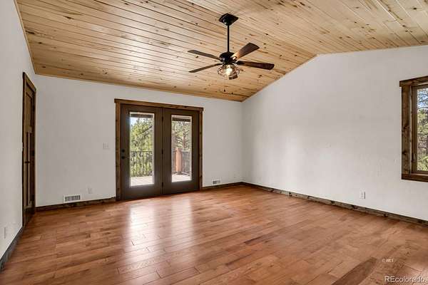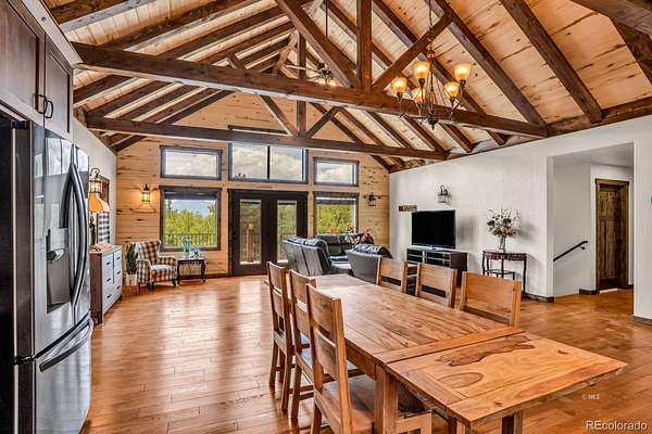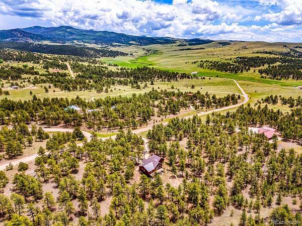 CUSTOM HOME WITH CATHEDRAL CEILINGS AND STARGAZER'S DREAM DECK -- Welcome to your peaceful retreat in the desirable Eastcliffe Subdivision! This beautifully crafted 3-bedroom, 2.5-bath steel-sided home sits on 5.73 wooded acres and offers the perfect blend of comfort, elegance, and breathtaking scenery. Step inside to an open-concept living, kitchen, and dining area, highlighted by soaring cathedral ceilings and rich woodwork throughout. French doors in both the living room and the spacious primary suite lead to a large back deck, where you'll enjoy inspiring views of the Sangre de Cristo Mountains. The primary bedroom also features an ensuite bath for your convenience and comfort. The main level provides everything you need for easy living, including a laundry area and access to the attached two-car garage. The fully finished walk-out basement expands your living space with a generous recreation room or second living area, two sizable bedrooms, and a full bathroom. French doors open onto a poured concrete patio surrounded by tall, mature trees that enhance the sense of seclusion and natural beauty. Whether you're relaxing on the deck, stargazing, entertaining guests, or enjoying the tranquility of your surroundings, this home is a rare gem!
