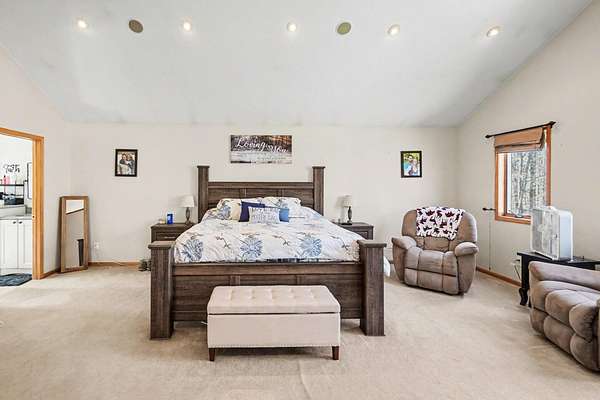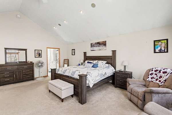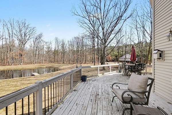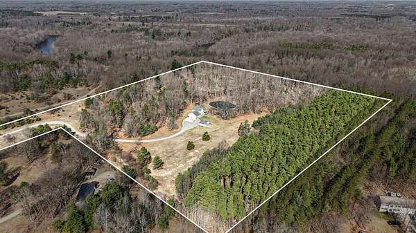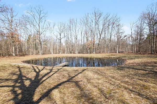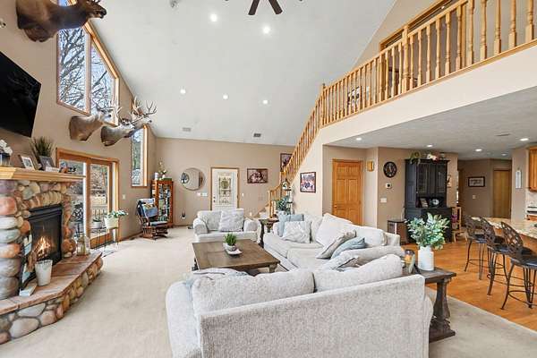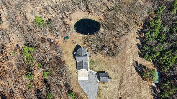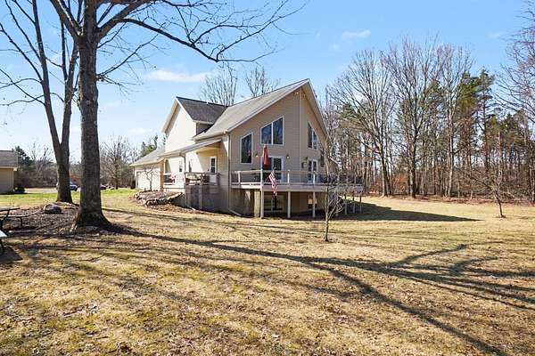 Open House SATURDAY APRIL 4 from 1pm-3pm. Or schedule a private showing of this amazing house and 22 acres. Located quite a ways off the road enhancing the private setting. Main level family room has cathedral ceiling with lots of windows for so much natural lighting. Also a stone fire place (gas) for those cool winter evenings. Open to living space is the kitchen with an island and dining area. Completing the main level just off the entry mud room is a large laundry room. A loft Primary Suite includes walk in closet, a beautiful tile walk-in shower, separate bathtub and an office nook. More family room/game room finished living space on lower level plus an office and full bath. Backyard has a large deck overlooking a well stocked 12' deep pond which includes a zip line and a dock. Attached oversized 3 stall garage with built in storage. Plus a bonus pole barn and storage shed behind the house. More extras include: Grain Bin Gazebo and Tree House!