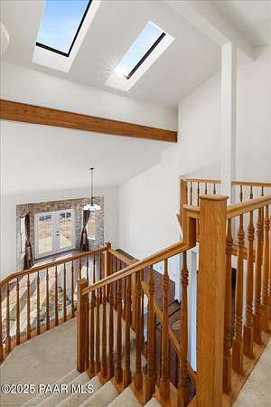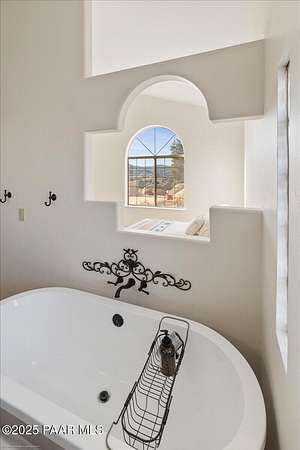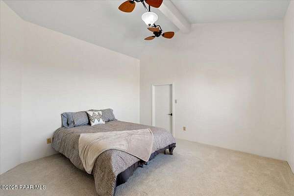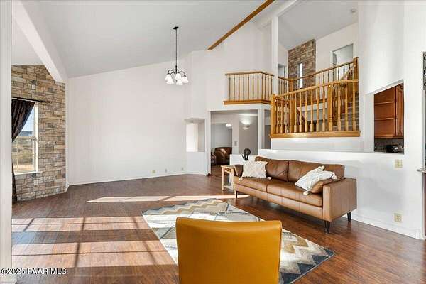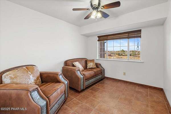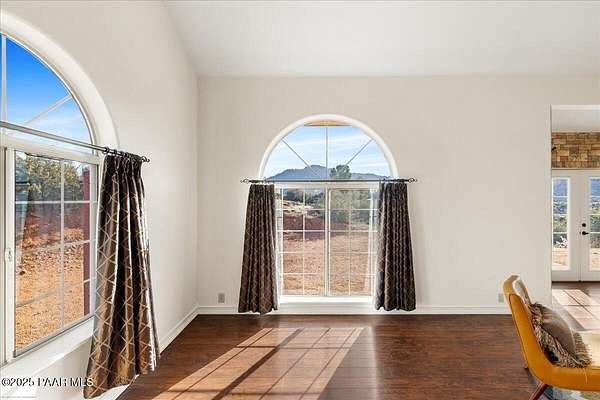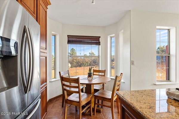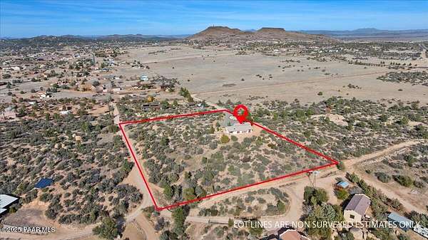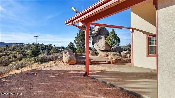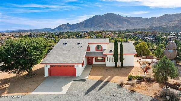Set on four private acres and framed by sweeping views of Granite Mountain, Williamson Valley, and striking natural boulder formations, this home offers a rare blend of space, privacy, and quiet beauty. Light-filled living spaces, warm wood floors, and a thoughtful layout create an effortless flow from everyday living to entertaining. The kitchen features custom cabinetry, granite countertops, upgraded appliances, a walk-in pantry, and a sunny breakfast nook that opens to the living and dining areas. The main level includes an office, den, guest bath, and a serene owner's suite with a new gas fireplace, expansive view window, walk-in closet, dual vanities, custom shower, and soaking tub. Upstairs, two generously sized bedrooms enjoy elevated views, including one with its own private bath--perfect for guests or extended stays. Outdoors, a covered patio invites long mornings and golden-hour evenings surrounded by open sky and natural landscape. Extensively updated with a new roof, skylights, interior and exterior paint, light fixtures, ceiling fans, new carpet in the primary suite, on-demand water heater, and water softener, this home is move-in ready while remaining deeply connected to its setting. This is more than a home--it's a place to slow down, breathe deeper, and settle in.