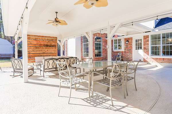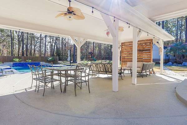 - Covered Front Porch, Covered Patio, Fence, Fenced Yard, Pool, Storage Shed