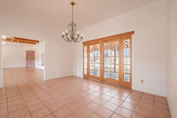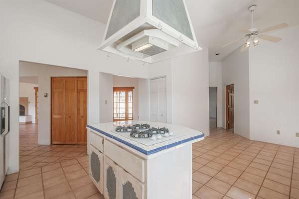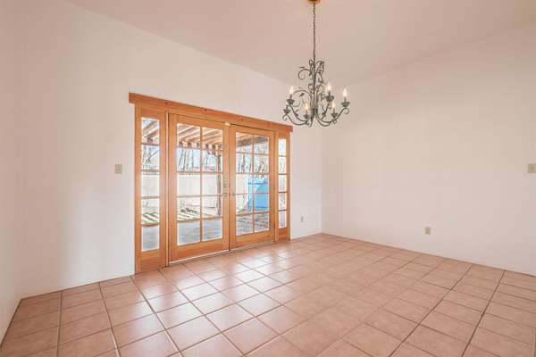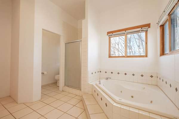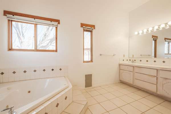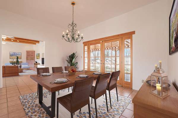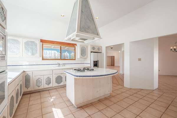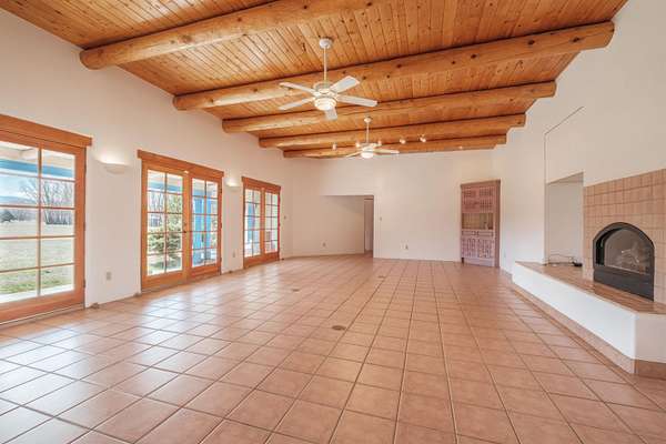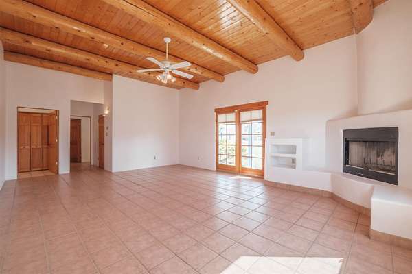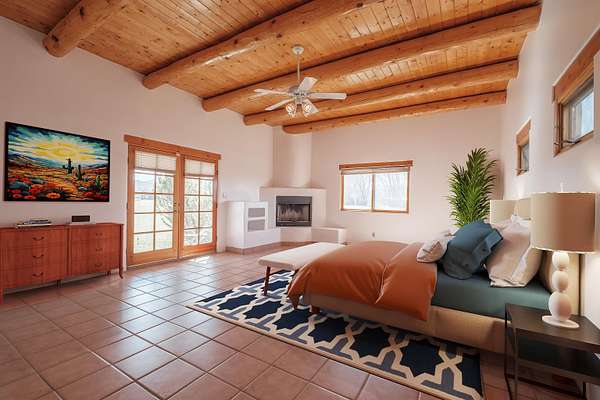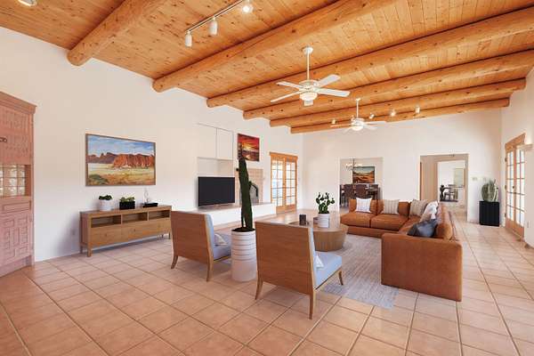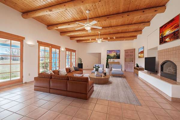 Lush & Pristine Oasis in the Heart of Town. Private, gated Pueblo style home tucked back from Camino del Medio. Enjoy spectacular eastern views from this beautifully maintained 3BR/2.5BA home, offering a bright, airy ambiance with high ceilings, tile floors, and abundant natural light throughout. The oversized portal enhances the home's spacious feel, perfect for relaxing or entertaining. This home is thoughtfully designed with two fireplaces, a jetted tub in the primary bath, a wet bar in the family room, and a separate dining room. The private backyard features an additional pergola, creating a serene outdoor retreat. A large laundry room, built-in shelving in the garage, and a well-planned layout add to the home's convenience. The kitchen showcases exquisite tinwork by Taos Pueblo artist Philip Gomez, adding a unique touch of craftsmanship. Zoned R-4, this property offers development potential if expansion is in your plans. Neighbor at 450 La Posta will be erecting a 6' Latilla fence to separate the properties. New water heater August 2025. Water rights included with this sale. A rare gem with endless possibilities-don't miss this incredible opportunity!