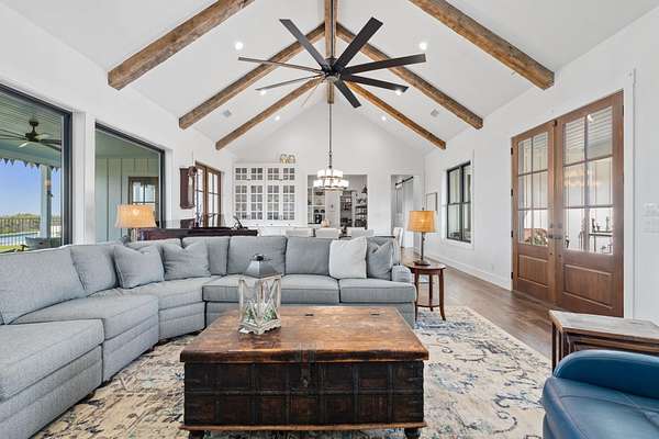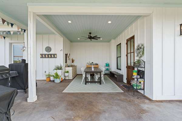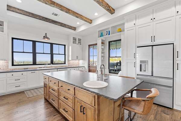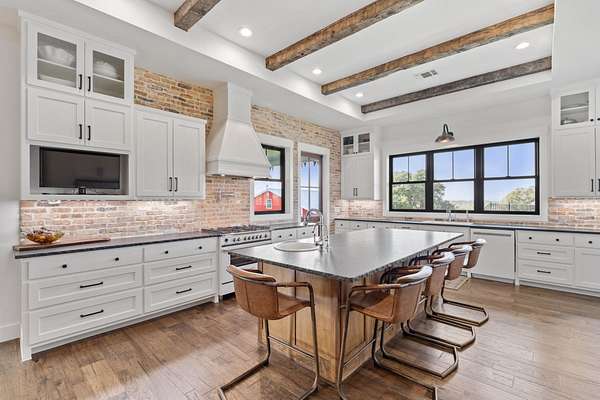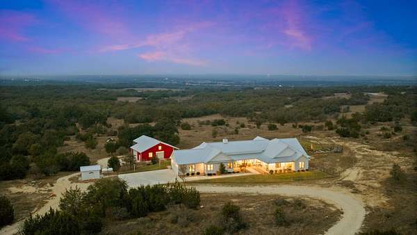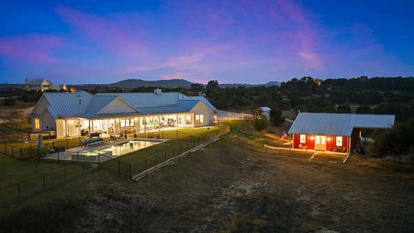 Set on 10 picturesque AG-exempt acres with sweeping Hill Country views, this exceptional single-story ranch-style estate offers privacy, comfort, and timeless Texas charm. A scenic drive leads to a thoughtfully designed residence with a heated swimming pool & hot tub, and stunning outdoor living spaces, a barn with guest quarters, full bath and kitchenette. The heart of the home is a spacious kitchen featuring custom cabinetry, granite counters with chiseled edges, Chicago brick backsplash, walk-in pantry, large island, and dual-fuel cooking. The large open living area boasts a gas fireplace and a vaulted ceiling with exposed wood beams, creating a warm yet grand gathering space. One wing offers 3 bedrooms and 3 baths, including a flexible front room suitable as a playroom. The private owner's suite is positioned on the opposite end of the house, featuring large windows overlooking the rolling hills. This wing also includes two additional bedrooms or offices/hobby rooms, with a hall bath. Laundry room, mud room, and a climate-controlled storage room, all leading to the attached double garage. Home has a whole house generator! Located just outside Johnson City, this rural retreat offers the perfect balance of seclusion and accessibility-Austin and San Antonio within a 60 min drive, and 30 miles to Fredericksburg's renowned wine country, and close to numerous state parks and lakes. This is Hill Country living at its finest-beautifully designed, thoughtfully equipped, and ideally located.