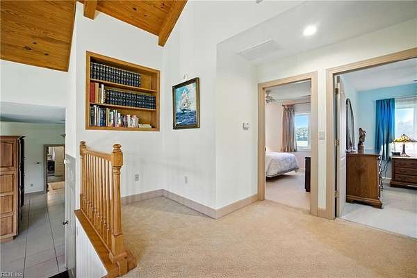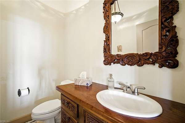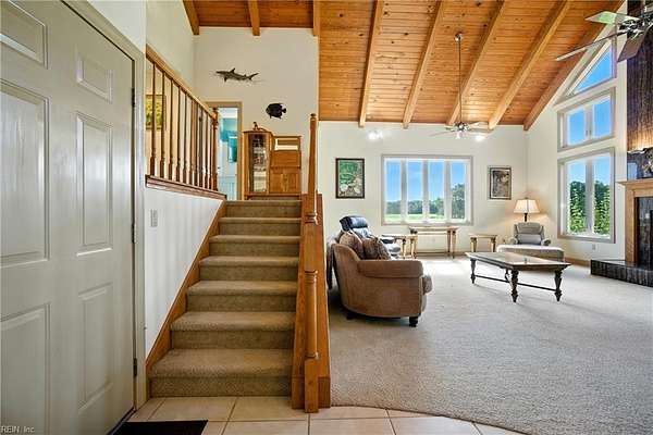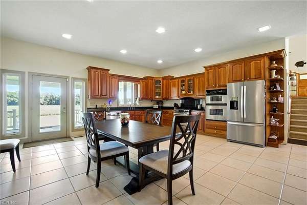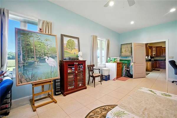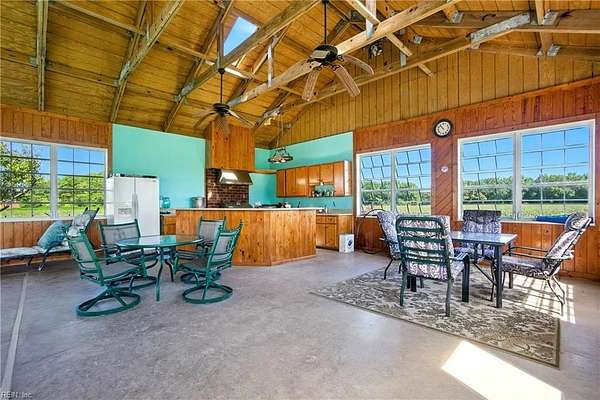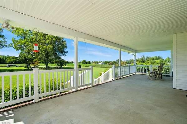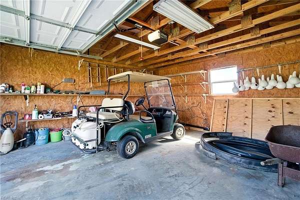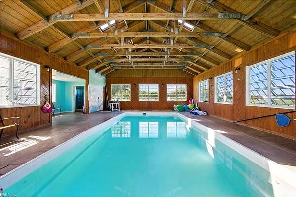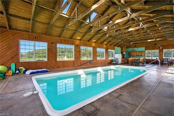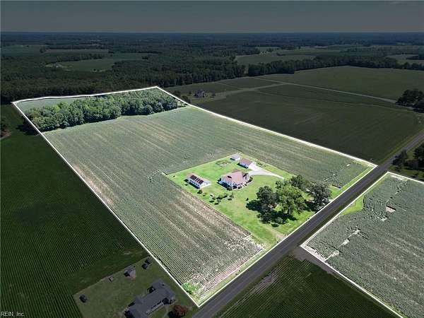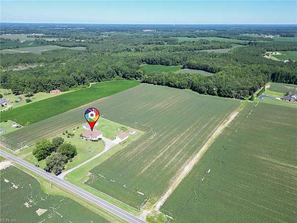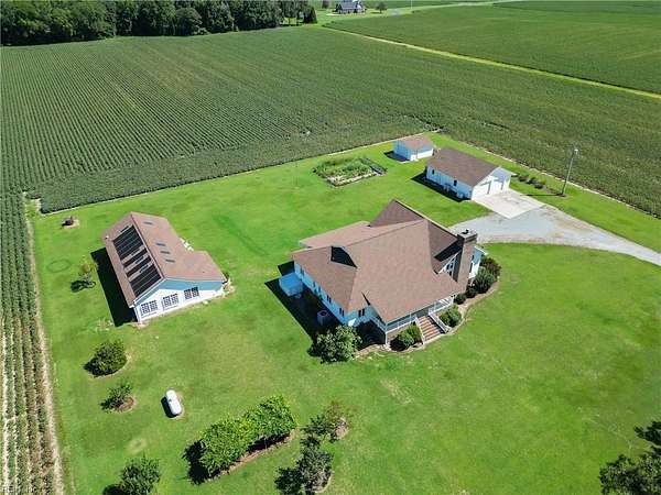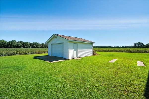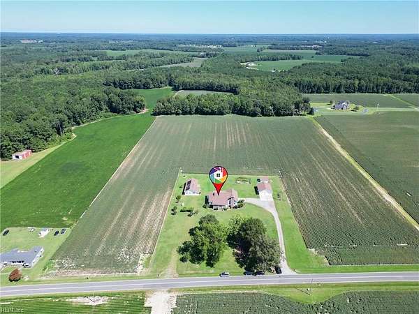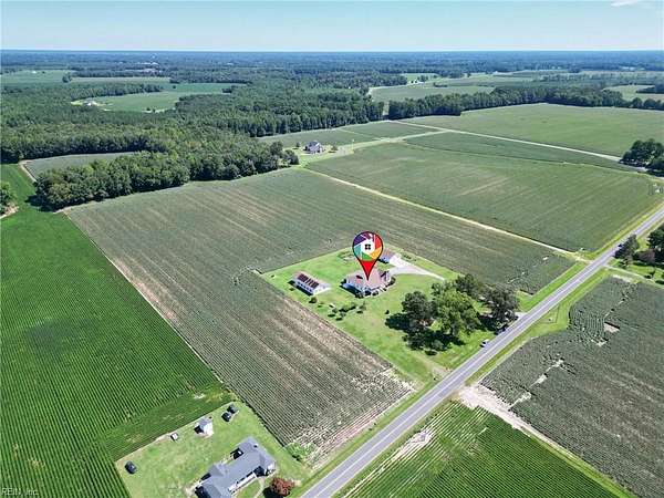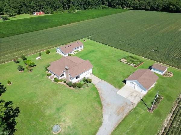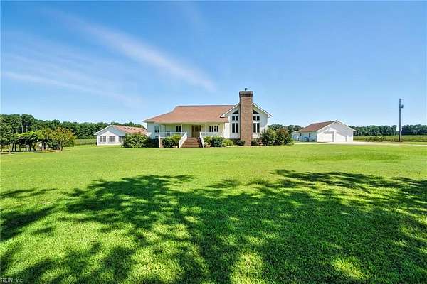 A custom-built home designed for comfort and functionality. The main level features a spacious living area with fireplace and vaulted wood-plank ceilings. The kitchen includes granite countertops, gas cooking and double ovens. A first-floor primary suite and laundry room support daily convenience. A first-floor flex room offers versatility for a potential fourth bedroom, home office, media room, and more. Outdoors living includes covered front and rear porches with recessed lighting. A pool house with a saltwater pool heated by solar, a kitchen and bath. Storage and parking options include an attached 2-car garage, a detached 3-car garage with bath, and a detached 1-car garage-for a total of 6 bays. A whole-house generator adds additional peace of mind. The property large acreage setting offers privacy, and opportunity for potential future projects. Conveniently access regional routes connecting to Hampton Roads, Raleigh, and surrounding areas. NC License #335993