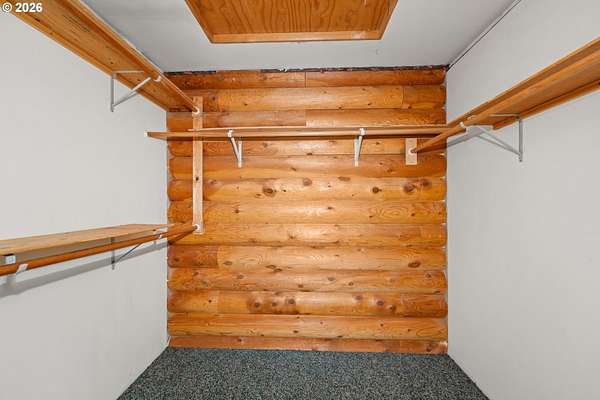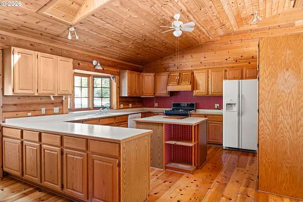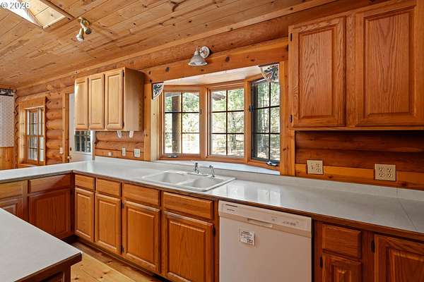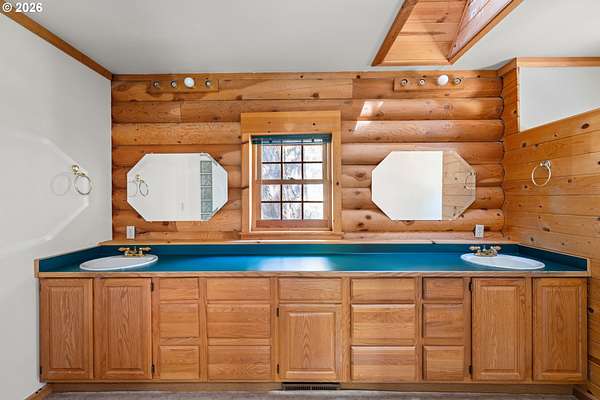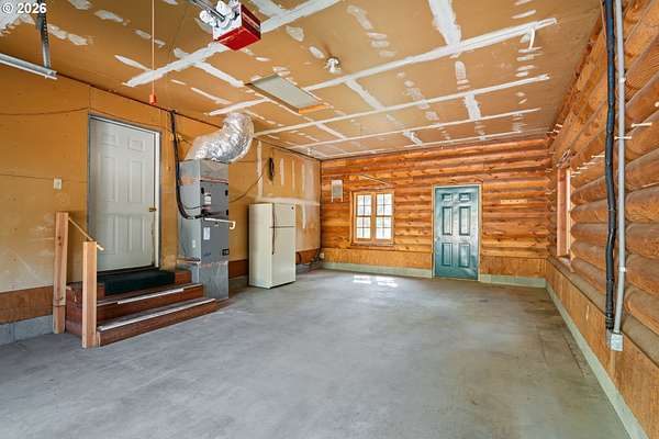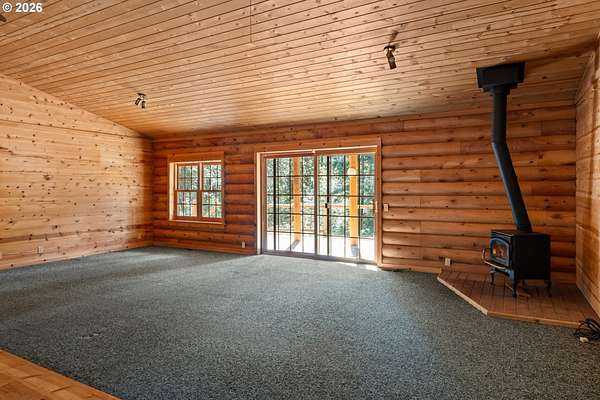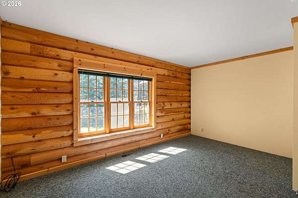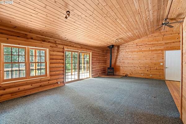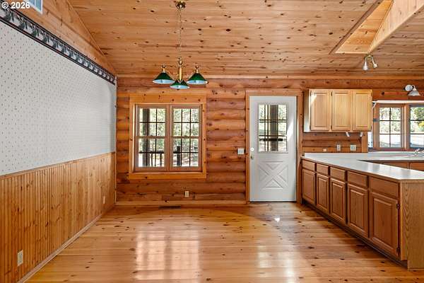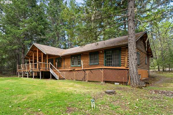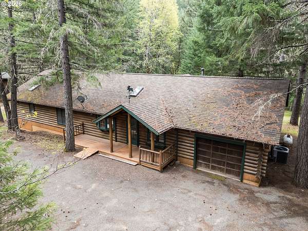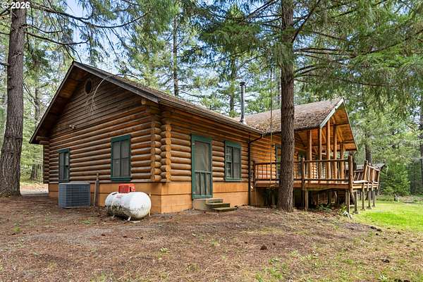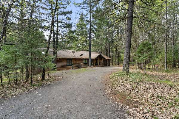 Escape to the charm of country living with this inviting 3-bedroom, 2-bath log cabin-style home set on 5 peaceful acres. Featuring a full log exterior and Marvin windows, this property blends rustic character with modern comfort. Inside, the kitchen and dining area showcase warm wood floors and vaulted ceilings, creating an open and welcoming space. The kitchen is well-equipped with a central island, generous cabinet storage, and convenient pull-out shelving. The living room offers vaulted ceilings, carpeting, and a wood stove. Classic wood paneling. The primary suite includes a private bathroom with dual sinks and a walk-in closet. Enjoy the outdoors from the large, partially covered back deck. Additional features include a forced air system with heat pump, an attached one-car garage, and an oversized detached garage/shop offering plenty of space for projects, storage, or hobbies. Two bonus rooms in basement with another unfinished space. Call today to find out more!