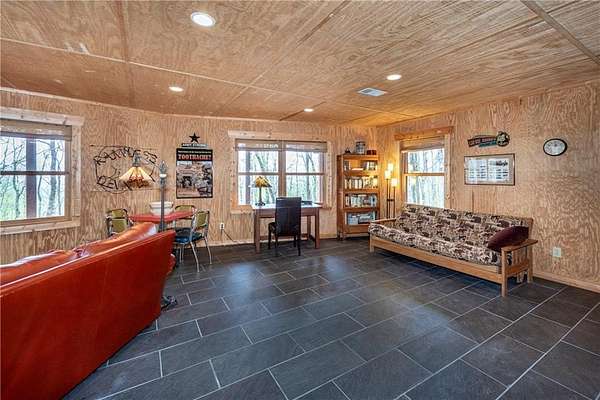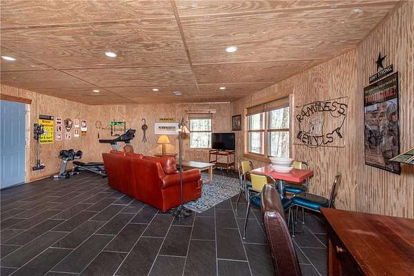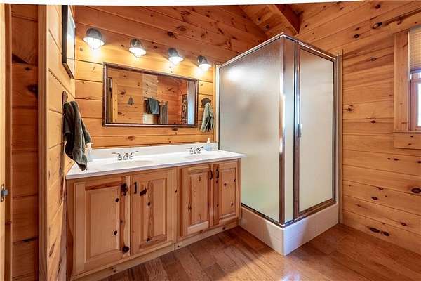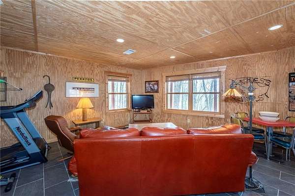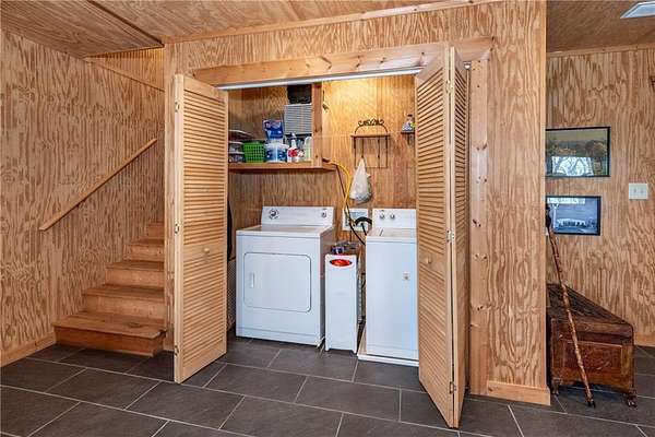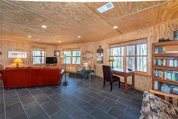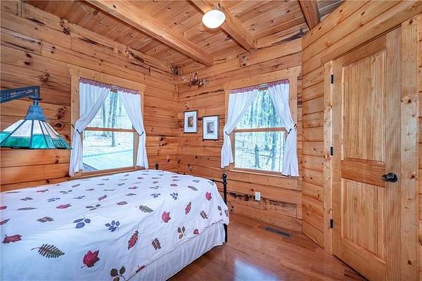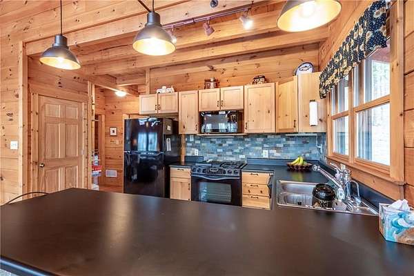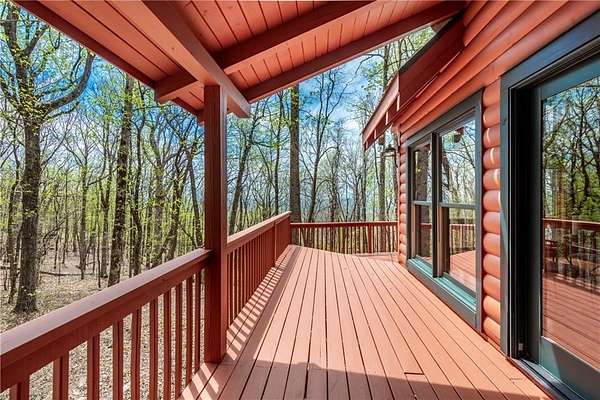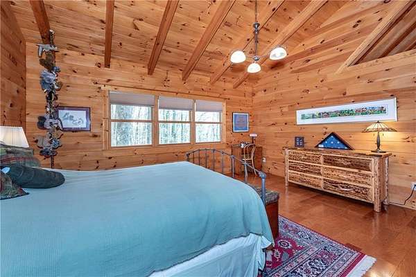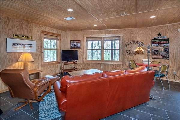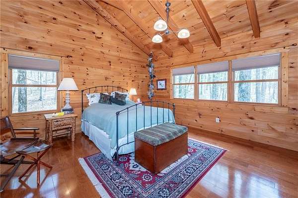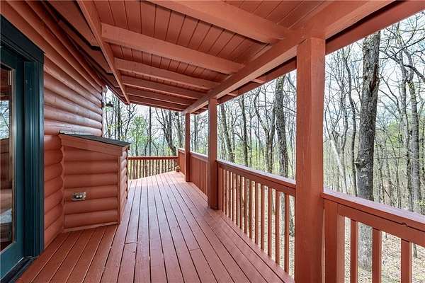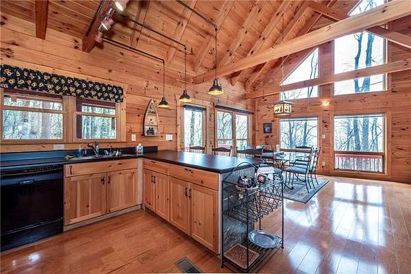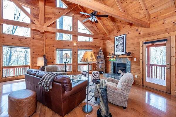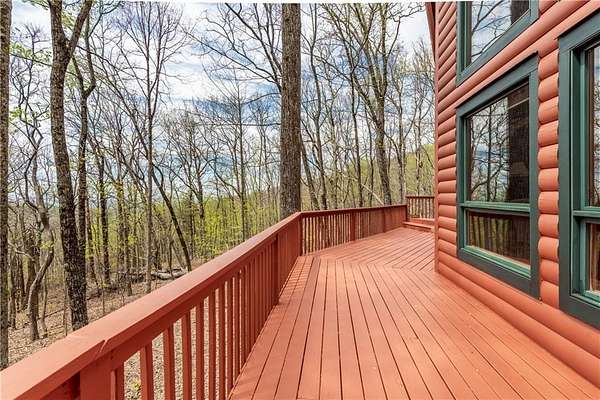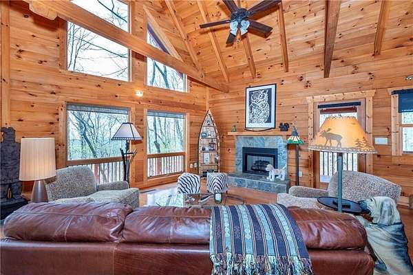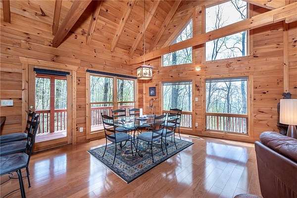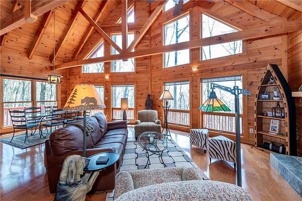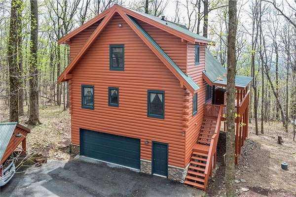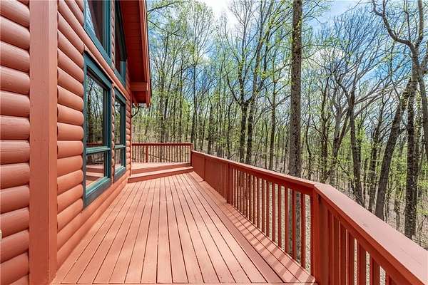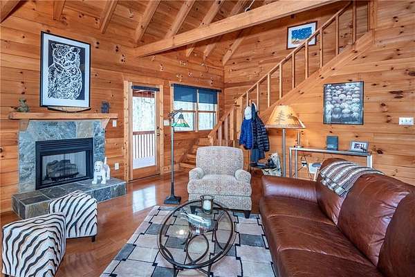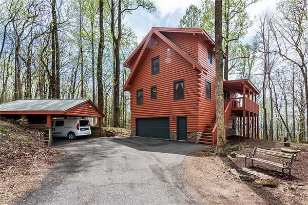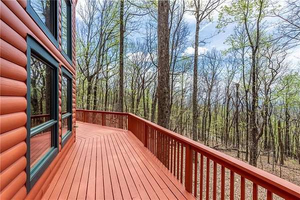 If you're searching for a private mountain getaway with the potential for breathtaking views, this is the perfect place to call home. Whether you're looking for a full-time residence or a vacation retreat, this one-owner property has been meticulously maintained and is quality throughout. The dramatic two-story family room features an entire wall of floor-to-ceiling windows, filling the space with natural light, along with a gas log fireplace and beautiful hickory floors throughout. The open floor plan flows seamlessly into the kitchen, complete with bar seating, a gas range, and a slate backsplash. Enjoy outdoor living at its finest with a wraparound covered porch on both sides of the home, plus a front deck-ideal for relaxing and taking in the peaceful surroundings. The main level offers two guest bedrooms and a full bath, while the spacious owner's suite occupies the entire upper level. This private retreat features a vaulted ceiling, walk-in closet, double vanity, and a separate shower. The daylight basement provides a large family or recreation room and could easily serve as a fourth bedroom if needed. Additional features include a one-car garage and a two-car carport. Situated on over 5 acres of wooded beauty, the property also includes a creek and small pond, creating a serene backdrop where you can enjoy watching wildlife daily. With all paved roads and a paved driveway, access is both easy and convenient.