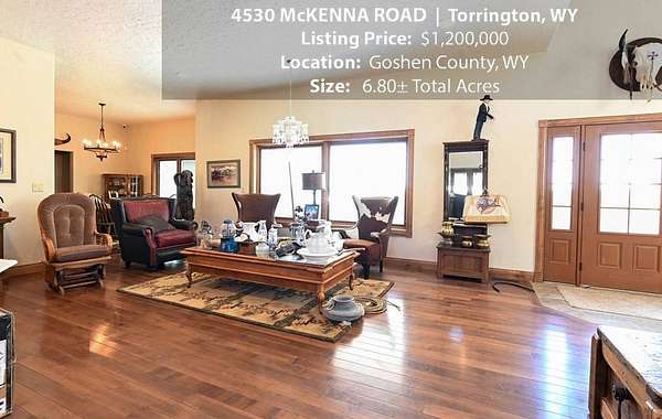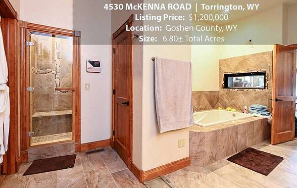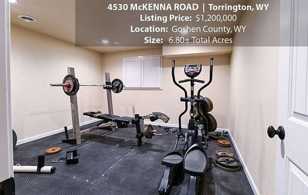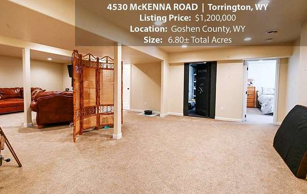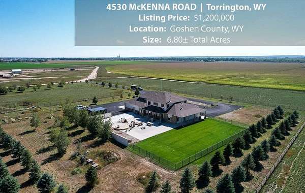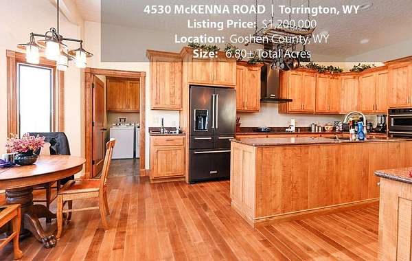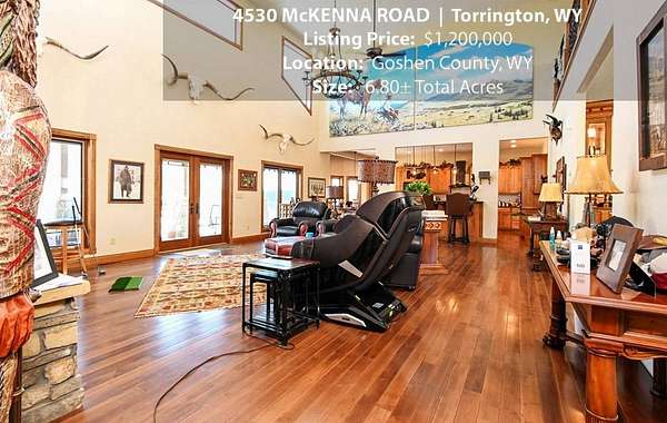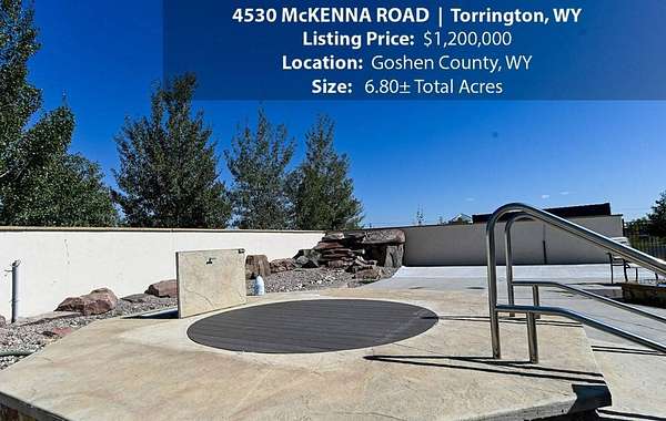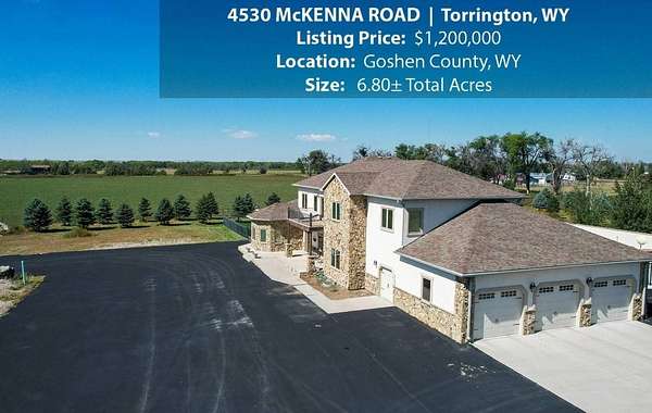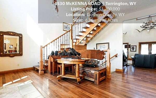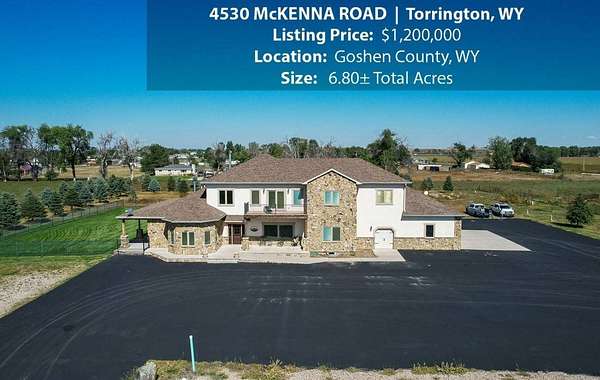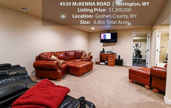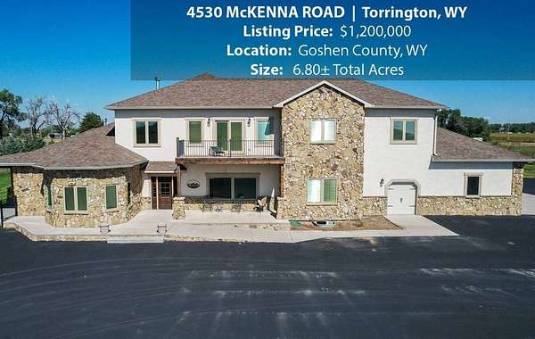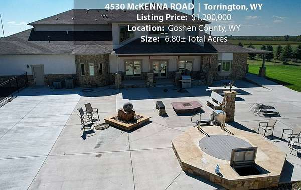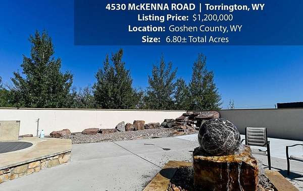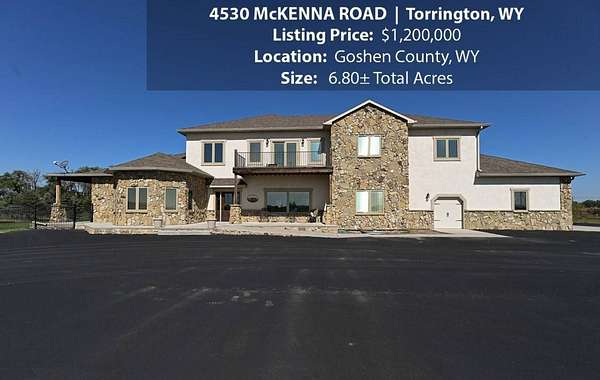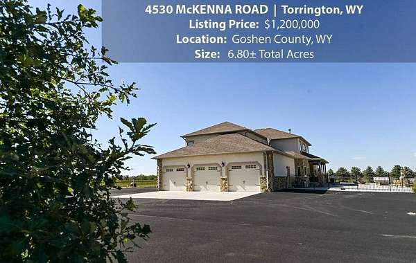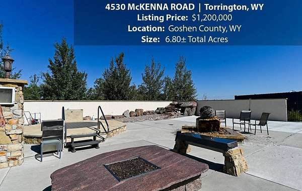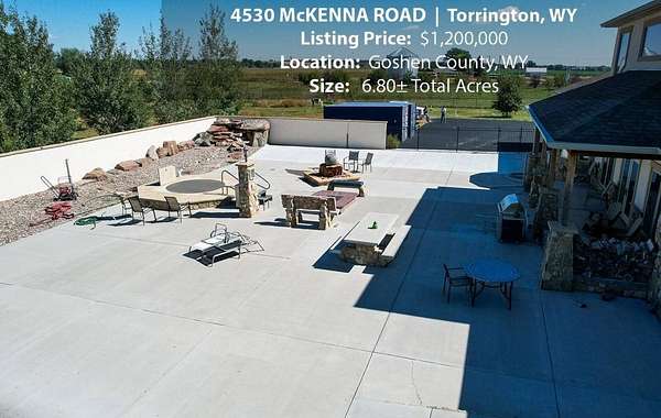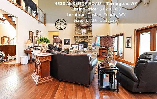 Located within walking distance of the Torrington Municipal Golf course and the North Platte River is 4530 McKenna Road. This stunning 4 bedroom, 4 bathroom home was built in 2016 and offers 4656 sq. ft. of living space on the main floor and over 6,000 sq. ft. of living space on 3 floors. The open concept of the main floor is enhanced by the 20 ft. ceilings and the stone-lined fireplace that accentuates the open floorplan. The kitchen is graced with granite countertops, hickory cabinets, and hardwood floors. Other interior features include dual natural gas heat and AC units, 2 on-demand hot water heaters, and a primary bedroom on the main floor that offers a custom bathroom with sauna, a jetted tub, and a walk-in shower. The home's upper level can be accessed from either end of the house and has 2 bedrooms, a full bathroom and a living area that over-looks the main floor living space. The basement level has another full bathroom along with the 4th bedroom and several rooms including a workout room, walk-in gun safe, and storage. The exterior features include a paved driveway that leads to the oversized 3 car garage, 140 trees that surround the property on 3 sides that all have their own irrigation system, and the fenced back yard with an underground sprinkler system. The home's custom courtyard offers a waterfall, a firepit and a grill that are powered by natural gas.