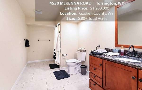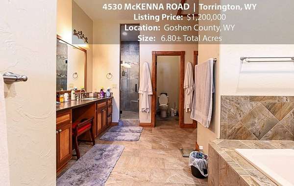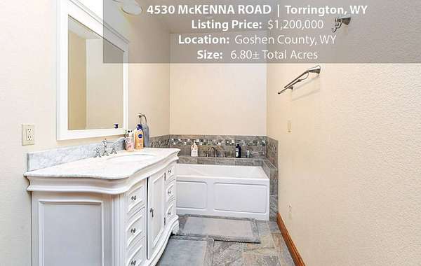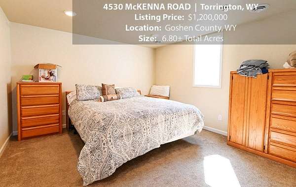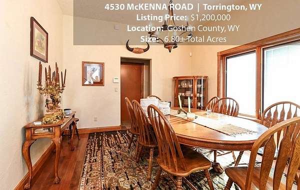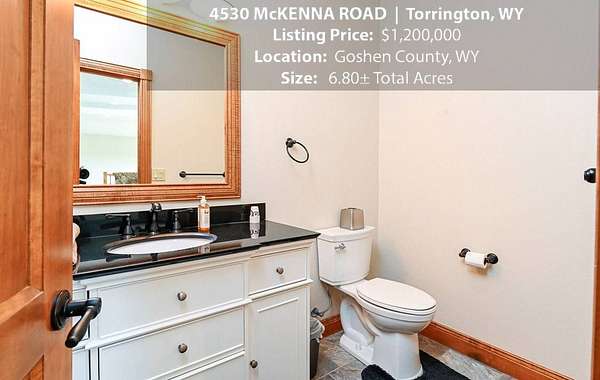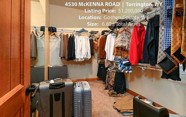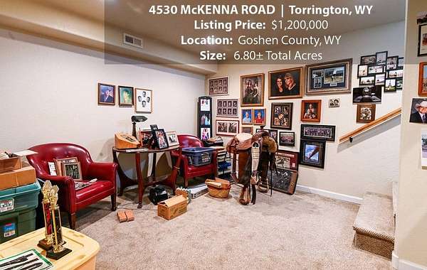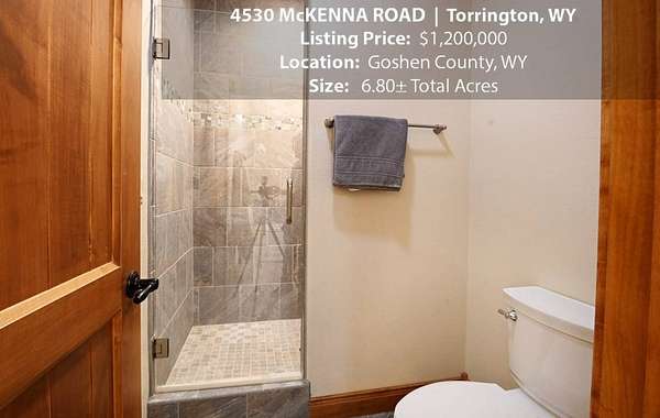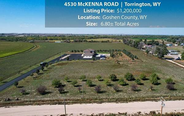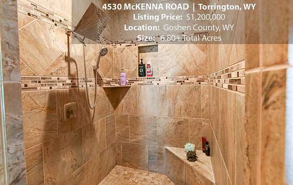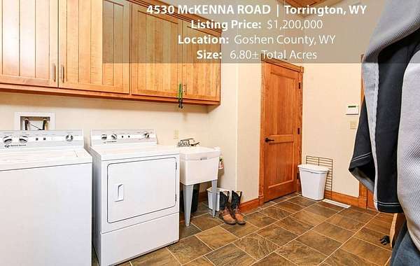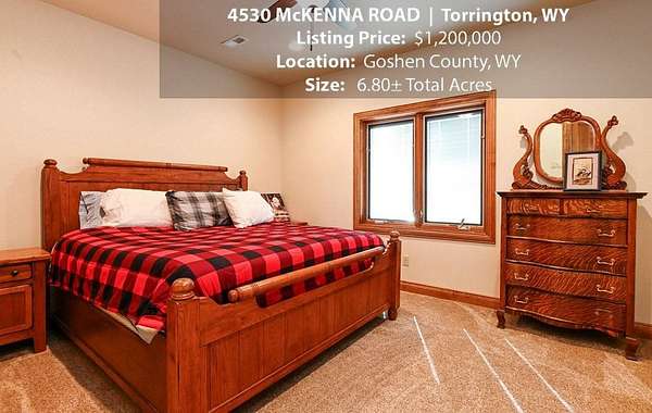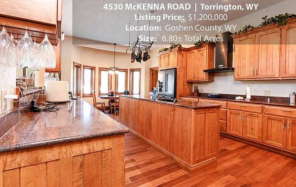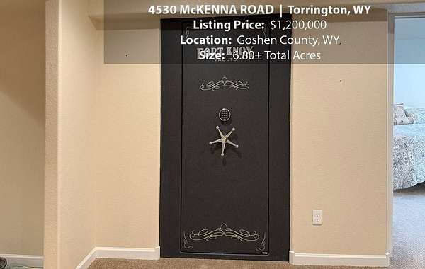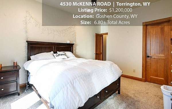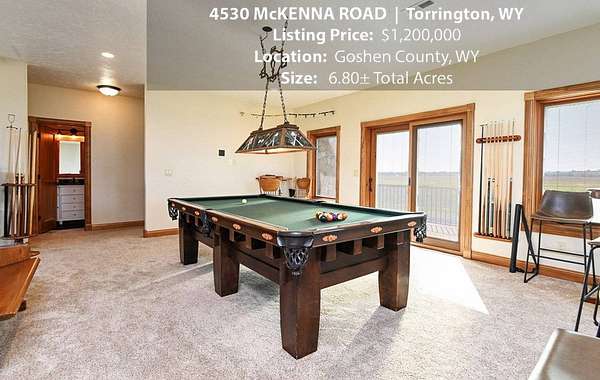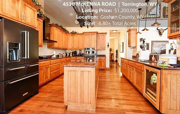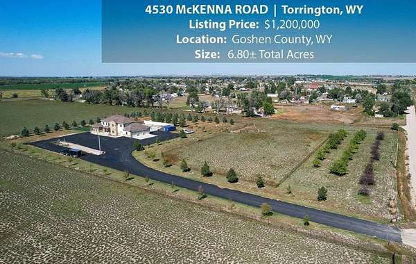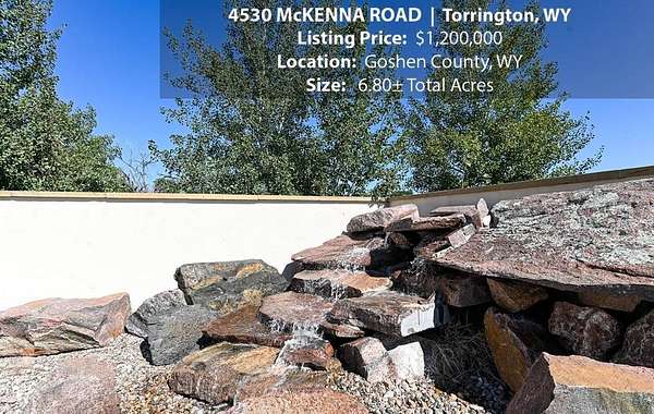 Located within walking distance of the Torrington Municipal Golf course and the North Platte River is 4530 McKenna Road. This stunning 4 bedroom, 4 bathroom home was built in 2016 and offers 4656 sq. ft. of living space on the main floor and over 6,000 sq. ft. of living space on 3 floors. The open concept of the main floor is enhanced by the 20 ft. ceilings and the stone-lined fireplace that accentuates the open floorplan. The kitchen is graced with granite countertops, hickory cabinets, and hardwood floors. Other interior features include dual natural gas heat and AC units, 2 on-demand hot water heaters, and a primary bedroom on the main floor that offers a custom bathroom with sauna, a jetted tub, and a walk-in shower. The home's upper level can be accessed from either end of the house and has 2 bedrooms, a full bathroom and a living area that over-looks the main floor living space. The basement level has another full bathroom along with the 4th bedroom and several rooms including a workout room, walk-in gun safe, and storage. The exterior features include a paved driveway that leads to the oversized 3 car garage, 140 trees that surround the property on 3 sides that all have their own irrigation system, and the fenced back yard with an underground sprinkler system. The home's custom courtyard offers a waterfall, a firepit and a grill that are powered by natural gas.