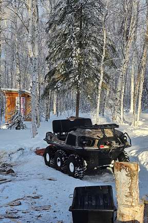The sale includes a 2022 ARGO Frontier Scout 6x6 XTV (~1,000 miles) and a steel trail trailer--the essential setup for you (seats 4), water, firewood, supplies, building materials, wild game. Trailhead parking at a constructed gravel road.