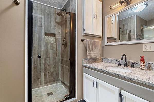 2020, overlooking the backyard. The remodeled bathroom features granite countertops and tile flooring. The main level includes two bedrooms, while the lower level offers an additional two bedrooms, a finished family room, and another bathroom.