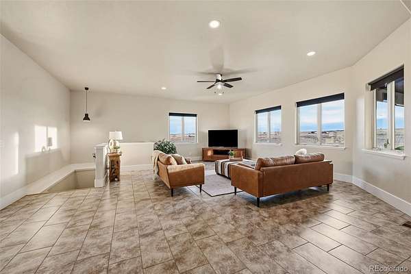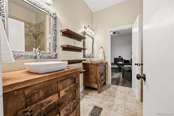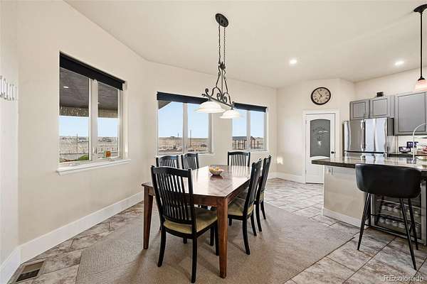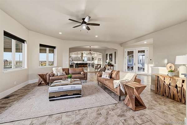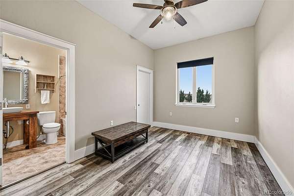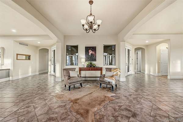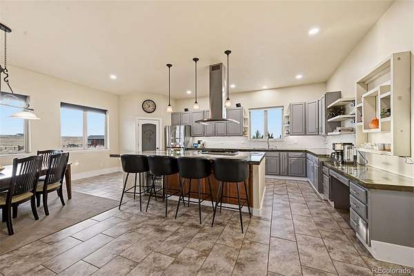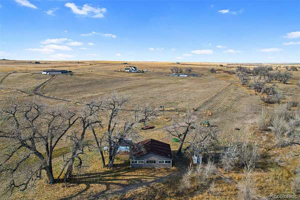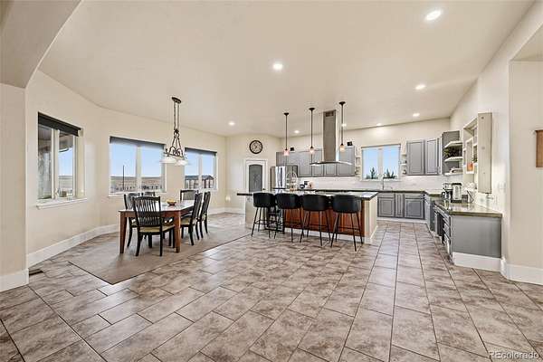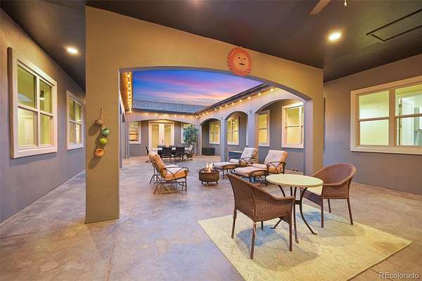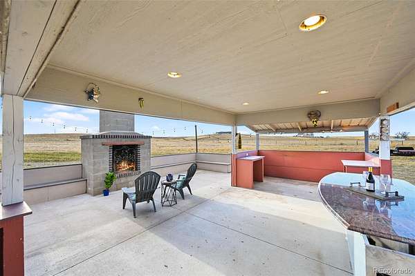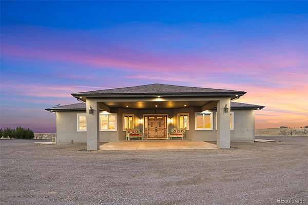 Welcome to this beautiful hacienda-style ranch estate, tastefully updated and designed for effortless indoor-outdoor living. Set on 35 private acres, this light-filled home offers 5,633 sq ft with an open floor plan that flows seamlessly throughout. Expansive windows bring in an abundance of natural light, while soaring 10-foot ceilings, custom lighting, accent paint, and quality flooring create a warm, elevated feel. At the heart of the home is a breathtaking 25’ x 45’ Spanish-style interior courtyard—framed by oversized windows and multiple glass doors—creating a true indoor-outdoor experience. Complete with a built-in Viking grill, this space is perfect for entertaining or relaxing under Colorado skies. The oversized kitchen is designed for gathering, featuring a large island, gas cooktop, custom cabinetry, walk-in pantry, and wine and beverage refrigerators. Large-format tile spans main areas, with engineered hardwood in bedrooms and smart lighting throughout. The primary suite offers a spa-inspired retreat. The home also includes six additional bedrooms, providing flexibility for guests, offices, or hobbies, along with six full bathrooms and one-half bath—each featuring custom handmade cabinetry and designer finishes. The finished basement expands the home’s versatility with a large wet bar, floating shelves, and custom details, plus space for a pool table or media area, along with a bedroom, bathroom, and storage. Outdoor amenities include a 40’ x 32’ shop, pavilion with fireplace, restroom/shower outbuilding, two RV hookups, fenced dog areas, and a wrap-around driveway. A seasonal creek, mature trees, and abundant wildlife enhance the peaceful setting. Located in Wolf Creek Estates, this gated property sits at the end of a quiet cul-de-sac and incredible dark-sky nights. No HOA & convenient access—15 min to Kiowa, 20 to Bennett, & approx. 25 to Aurora. A rare Colorado estate offering exceptional space, privacy, and lifestyle.