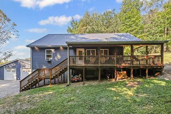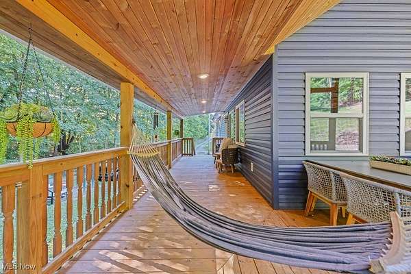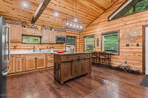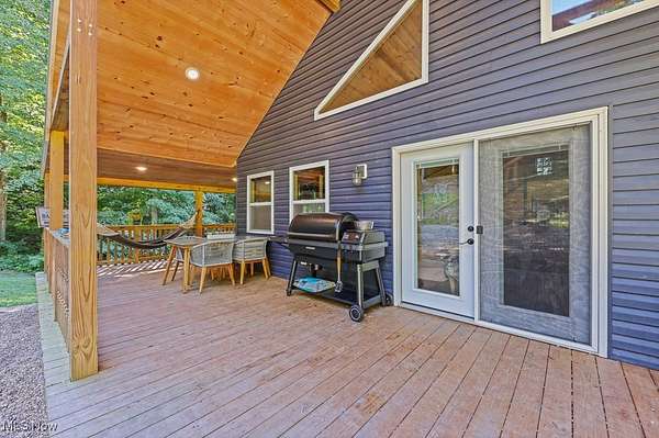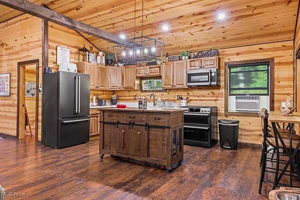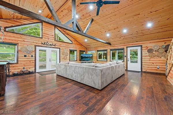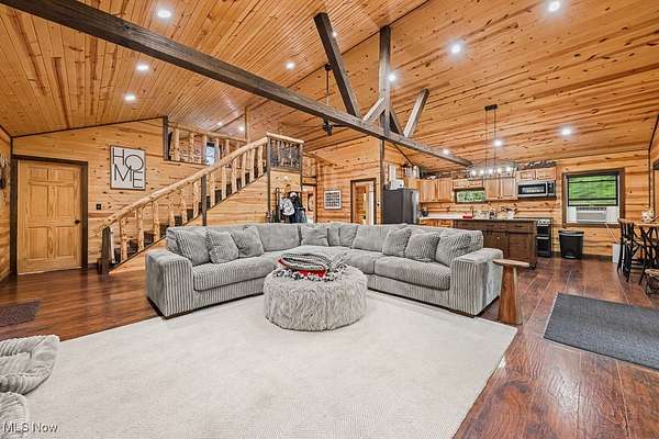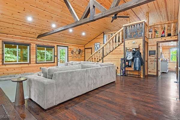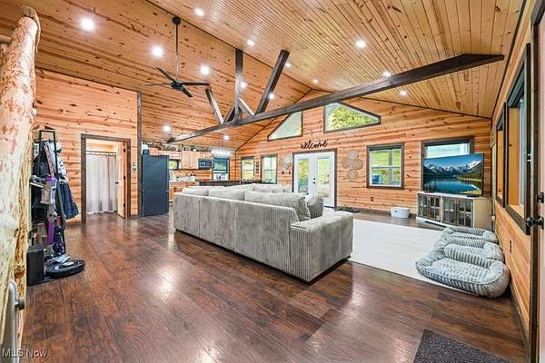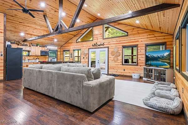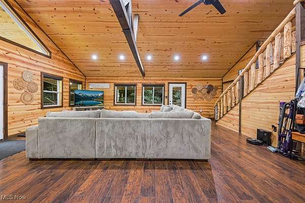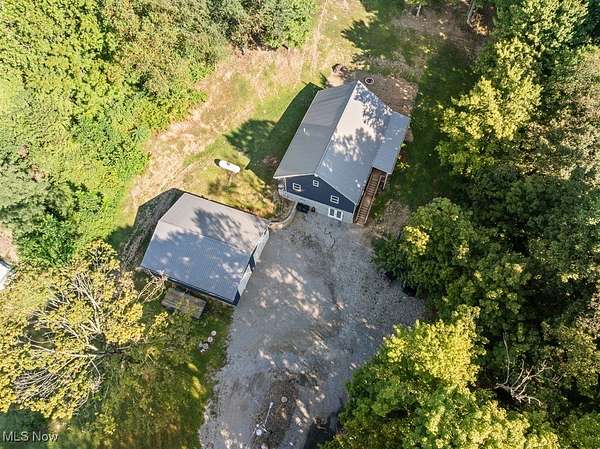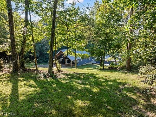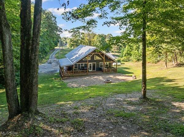 Welcome to your own private paradise. Built in 2019, this one-of-a-kind A-frame style ranch with a walkout basement sits on 3.58 scenic acres. The property features a serene backyard pond with a stunning rock wall and a wrap-around covered porch with recessed lighting, perfect for relaxing or entertaining. Inside you will find an open concept floor plan with vaulted ceilings, exposed wood beams, and abundant natural light. The kitchen offers quartz countertops, a large island, and plenty of space for gathering. The loft provides a versatile area that can serve as a third bedroom, office, or hangout space. The main floor includes the master suite with full bath, as well as an additional bedroom and full bathroom. The oversized garage is finished and designed for more than just parking. It includes a bar, pellet stove, 125-amp service, concrete floor with drain, and ample space for projects or entertaining. Additional features include a spray aeration system, propane furnace and stove with the remainder of the home powered by electric. Mineral rights do not convey with the property. This home offers the perfect balance of peaceful country living and modern comfort. Do not miss the opportunity to call it yours.
