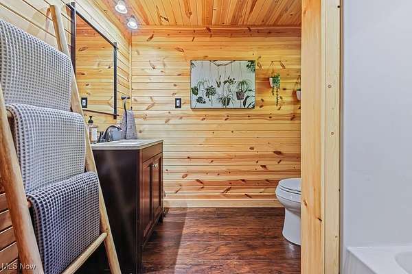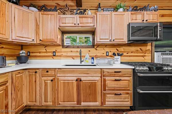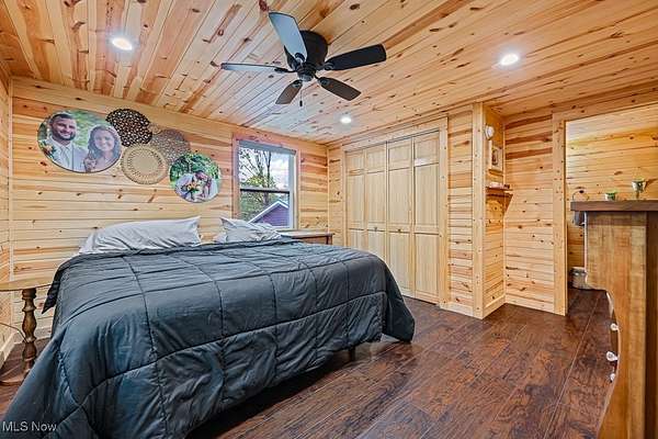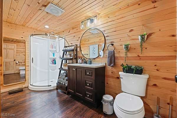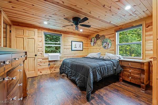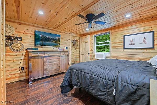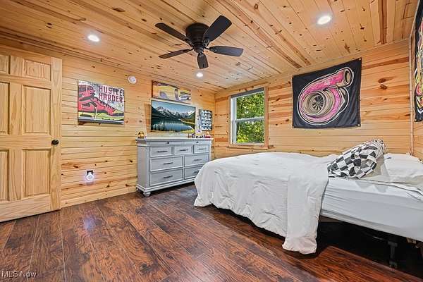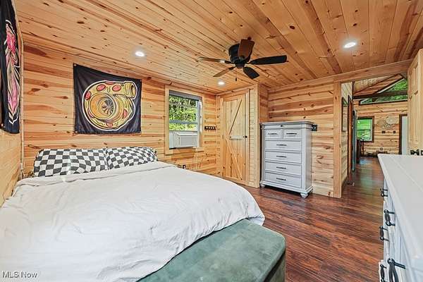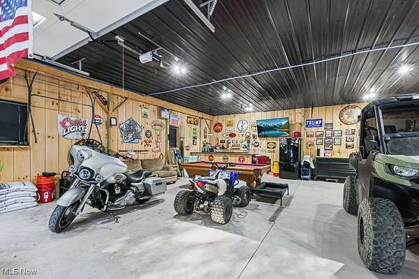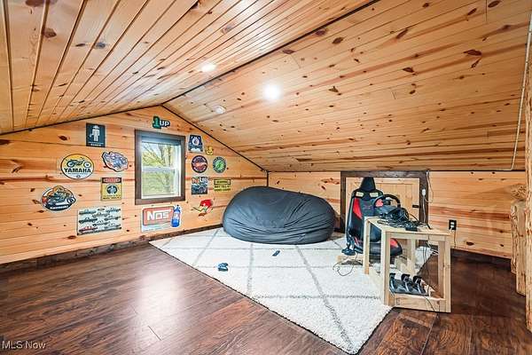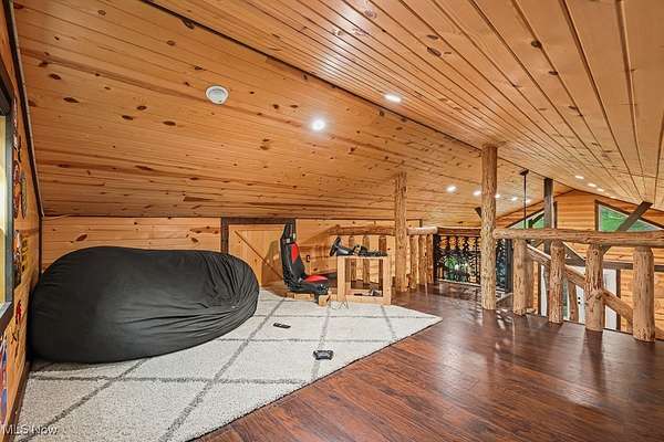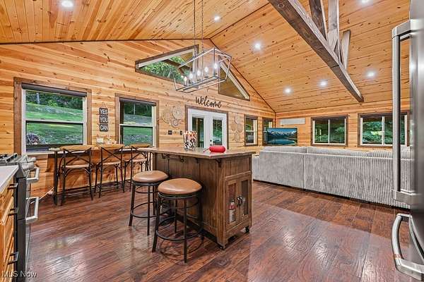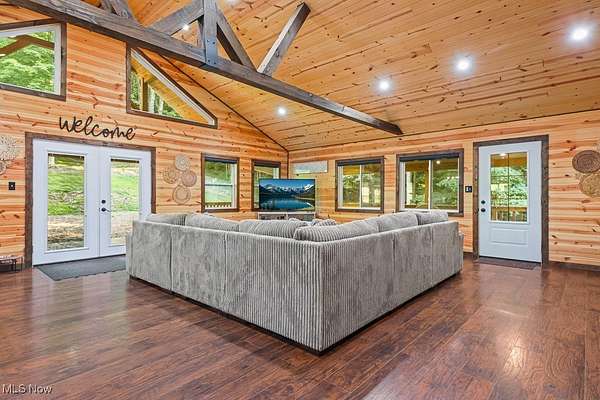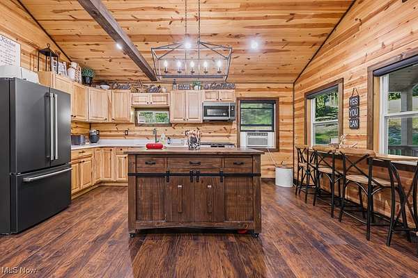 Welcome to your own private paradise. Built in 2019, this one-of-a-kind A-frame style ranch with a walkout basement sits on 3.58 scenic acres. The property features a serene backyard pond with a stunning rock wall and a wrap-around covered porch with recessed lighting, perfect for relaxing or entertaining. Inside you will find an open concept floor plan with vaulted ceilings, exposed wood beams, and abundant natural light. The kitchen offers quartz countertops, a large island, and plenty of space for gathering. The loft provides a versatile area that can serve as a third bedroom, office, or hangout space. The main floor includes the master suite with full bath, as well as an additional bedroom and full bathroom. The oversized garage is finished and designed for more than just parking. It includes a bar, pellet stove, 125-amp service, concrete floor with drain, and ample space for projects or entertaining. Additional features include a spray aeration system, propane furnace and stove with the remainder of the home powered by electric. Mineral rights do not convey with the property. This home offers the perfect balance of peaceful country living and modern comfort. Do not miss the opportunity to call it yours.