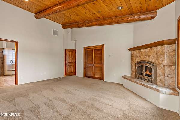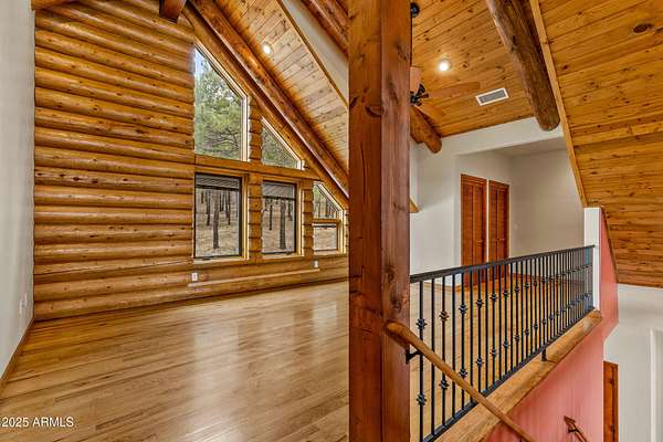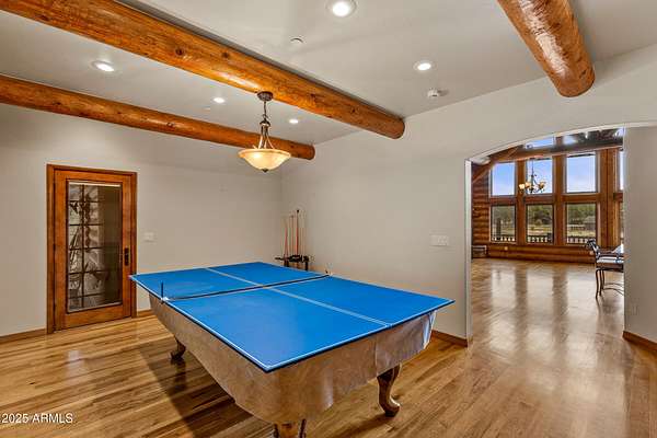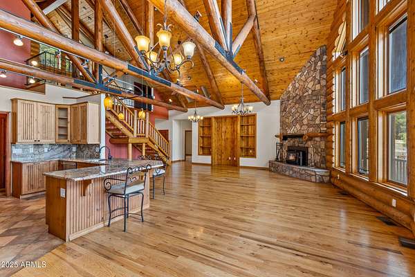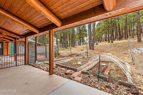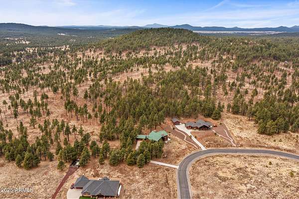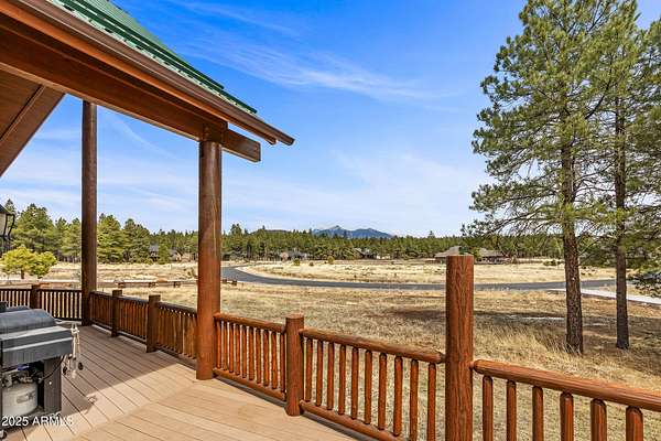 This stunning log-sided home with a metal roof sits on 2.19 acres of privacy and quiet, backed by Forest Service land, with a direct view of the San Francisco Peaks from the wraparound porch. Offering 5 bedrooms and 3.5 baths, the main level includes a spacious primary suite plus a guest bedroom with its own private bath. The open floorplan highlights a dramatic stone fireplace in the living room, a kitchen designed for entertaining, and a pool/ping pong room for fun gatherings. Upstairs, a loft makes the perfect office space along with additional bedrooms. Outdoors, enjoy the oversized garage, outdoor fireplace, garden, and paved driveway. Nestled within a gated community, this property combines comfort, beauty, and tranquility-plus endless opportunities to hike, bike, and be outside!