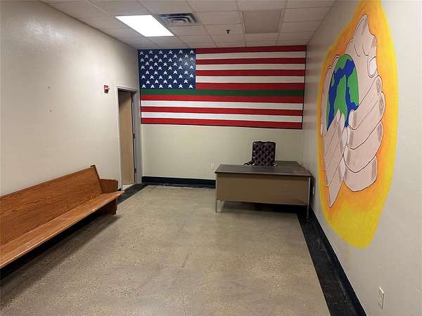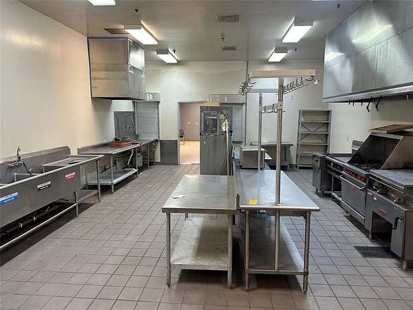 The main building is approximately 22,316 sq ft with a brick exterior and a durable metal roof. Inside, the floorplan includes oversized rooms, large attached bathrooms, wide hallways, and multiple common areas suited for group living, training, or retreat-style operations. A full commercial kitchen remains in place, featuring a gas cook line with flat top, fryers, and commercial refrigeration. The property also includes a spacious laundry area and a separate 1,600 sq ft storage building with two bay doors.