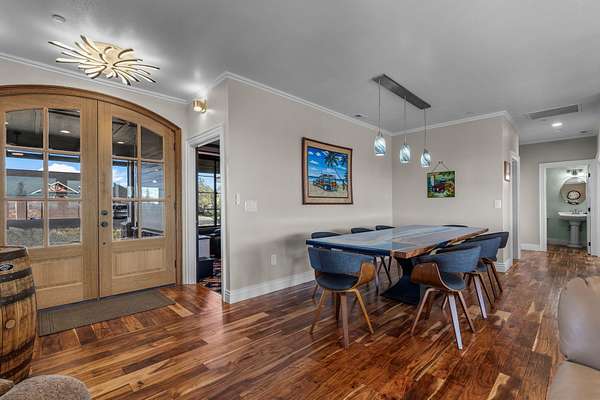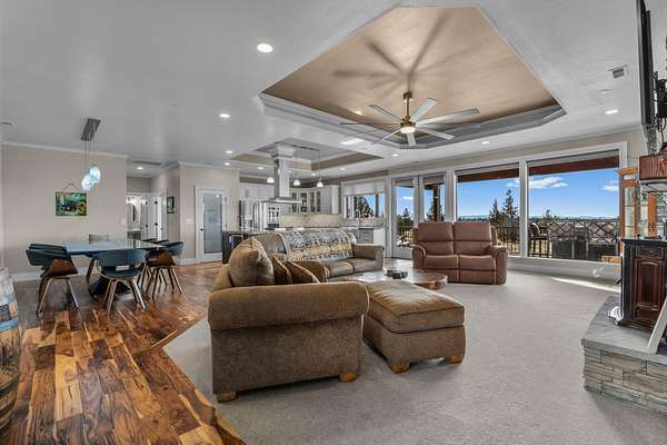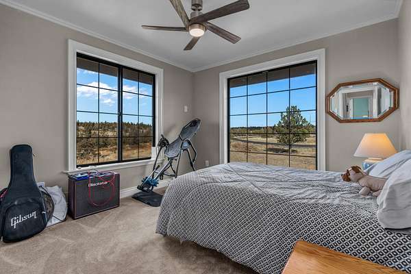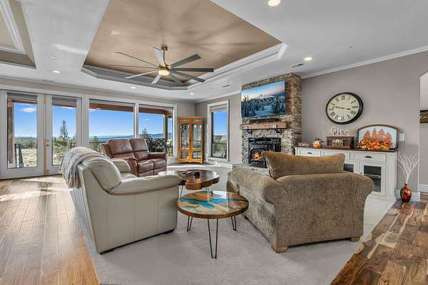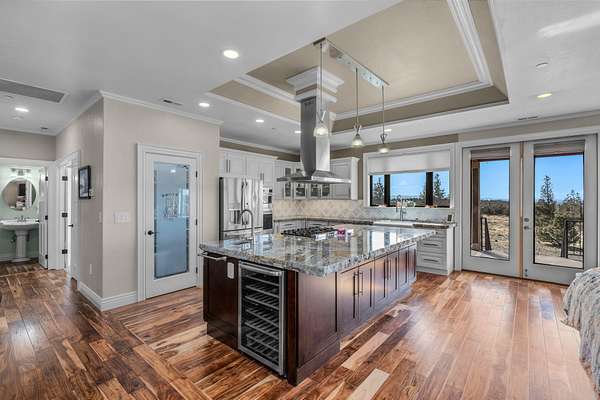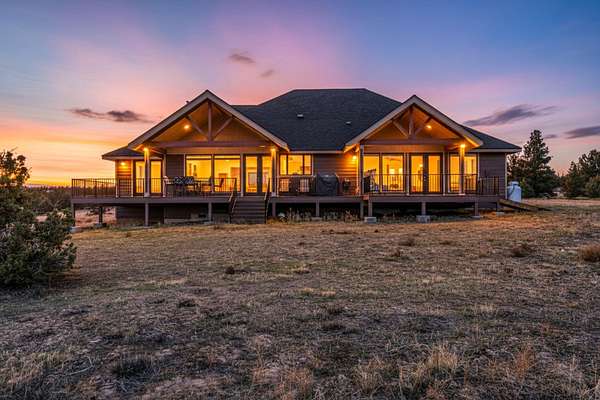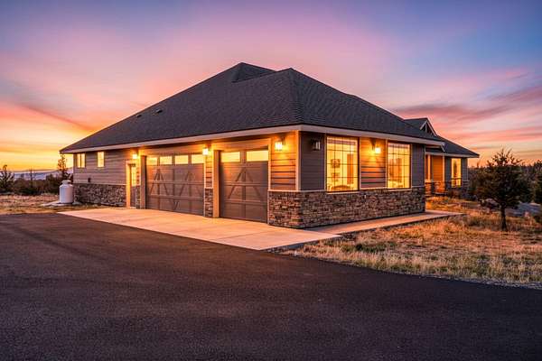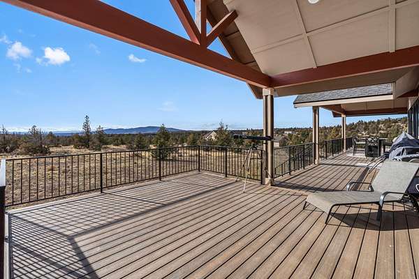 Elegantly nestled within the prestigious gated community of Longhorn Ridge, this 2023 custom built single story home offers 2,319 sqft of refined living on 4.91 acres just 15 minutes from town. Enjoy sweeping desert & Cascade Mountain views from the expansive back deck. The open concept layout features 9ft coffered ceilings wood floors & designer finishes throughout. The gourmet kitchen showcases a massive granite island, ZLINE propane cooktop European hood wine fridge wet bar & custom soft close cabinetry w/ under cabinet lighting. The luxurious primary suite includes an electric fireplace walk-in closet double vanity & 5-head tiled shower w/ bench plus private deck access. The fully insulated & heated shop is finished w/ Sheetrock & includes an air compressor welder plugs & a removable custom paint booth ideal for vehicle restoration or hobbies. Additional features include a home theater w/ six leather recliners a 3-car garage, laundry room w/ sink & an asphalt driveway. Call Today!