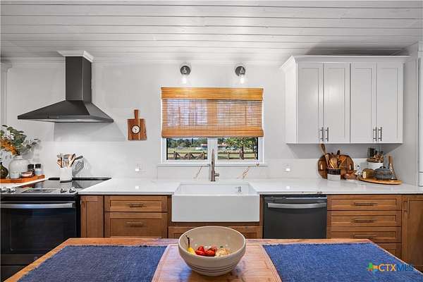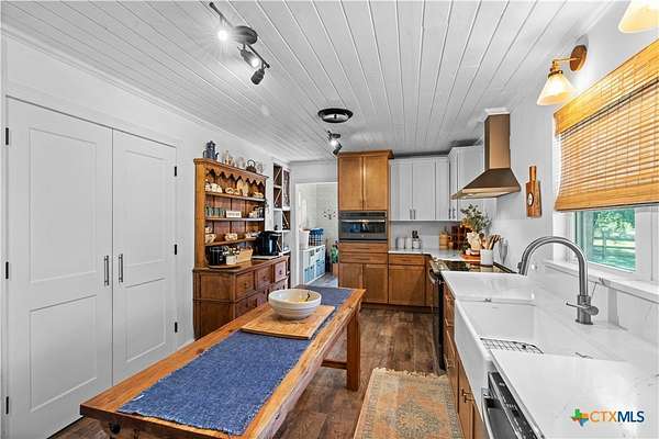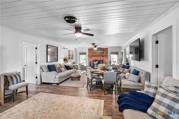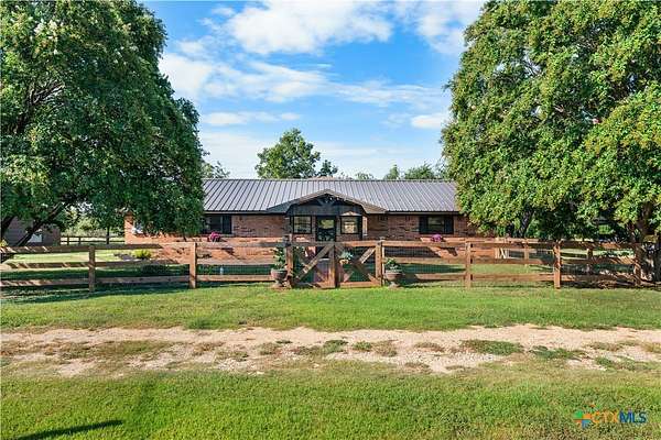 This stunning remodeled 3-bedroom, 3-bath home perfectly blends modern comfort with country charm. Step inside to a spacious den with wood-look laminate flooring and a cozy brick fireplace, opening seamlessly into the kitchen featuring quartz countertops, custom two-tone cabinetry, farmhouse sink with backyard views of mature pecan trees, new appliances, and a large walk-in pantry with pot filler. The primary suite is a true retreat, boasting a wood-accent ceiling, private fireplace, and a spa-like bath with double vanity, Bluetooth speaker, and oversized tiled shower. Two additional oversized bedrooms provide plenty of space for family or guests. There is a flex room that is currently being used for an office with a spacious closet. A mud/laundry room conveniently sits just off the back entry. Outdoors, enjoy a 16x24 finished Morgan building complete with split heating/cooling-ideal for a home office, guest suite, or hobby room. Additional improvements include an open barn, detached garage, carport with storage, and all-new fencing with added trees that enhance both privacy and tranquility. A durable metal roof was installed in 2022, and full renovations from 2021 to 2025 make this property completely move-in ready