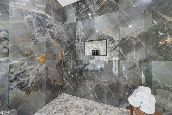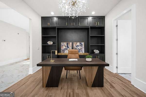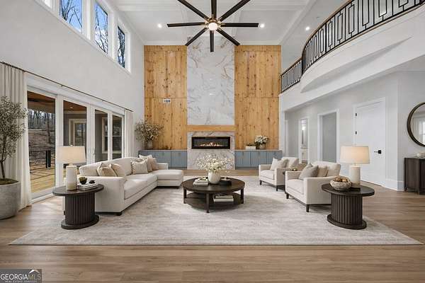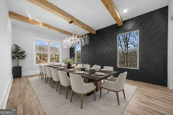 4543 Fawn Path is a new construction luxury estate where craftsman architecture meets a boldly modern interior, set on 2+ private acres in the heart of North Hall. The two-story great room sets the tone immediately - soaring exposed-beam ceilings, a dramatic floor-to-ceiling cedar accent wall, iron-clad second-floor catwalk, and a linear marble-surround fireplace that commands the space without overwhelming it. The chef's kitchen delivers marble countertops, custom cabinetry, a walk-in pantry, and a wine rack, all open to the living area and designed for the kind of entertaining that doesn't require apology. A separate dining room seats twelve beneath a sculptural chandelier, its geometric black accent wall and raw wood ceiling beams making a statement that is unmistakably intentional. A private study with full custom built-ins completes the communal space. The primary suite on the main level is truly a masterpiece - a cedar accent wall, private marble fireplace, and direct access to the rear patio framing a space that feels as considered as it is spacious. The spa bath is clad floor-to-ceiling in dramatic dark marble with gold veining, anchoring a freestanding soaking tub, an oversized glass-enclosed shower, double vanity and makeup station, and a custom walk-in closet scaled for serious storage. Five additional bedrooms with ensuite baths occupy the upper level. The unfinished terrace level spans over 3,900 square feet - stubbed for a bath and ready to be finished to your vision. Mountain views, a 3-car garage, sought-after North Hall schools, and a location convenient to shopping and major routes round out an estate that earns every square foot of its presence