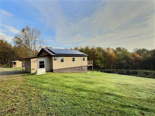 Secluded Ranch Retreat on 46+ Acres with pond, trails, and modern off-grid capabilities. Welcome to your private escape! Where comfort meets adventure on over 46 Acres of serene, usable land. This Ranch/Cabin-style home offers the perfect blend of rustic charm and modern convenience, complete with a wraparound deck overlooking a fully stocked pond (blue gill, small mouth bass, catfish) and breathtaking natural surroundings. Inside the home, you will appreciate the cozy feel with beautiful upgrades. Newer kitchen appliances, new washer/dryer combo, plus on-demand hot water. Extra room can be used as a bedroom or as a spacious entry/mud room. There are countless practical upgrades designed for comfort and efficiency. A solar system paired with new lithium-ion batteries, a Sol-Ark converter, and a well maintained 15kW Generac generator ensures reliable, sustainable power. New shed with electric, and small room heater, offers great storage or an added place to stay. Unique outhouse right beside adds convenience. Step outside and enjoy your own personal paradise, ideal for peaceful mornings or family fishing afternoons. This property is thoughtfully set up for outdoor enthusiasts, featuring established food plots with completed Spring planting, trails throughout the woods, and tree stands already in place-making it a turnkey hunting retreat. The land is partially bordered by a stone fence, adding timelss character. Whether you're exploring, riding, or simply soaking in the quiet, this property delivers a true escape from the every day. Bridge entry to the home has been certified for 80k+ lbs. This property is more than a home, it's a lifestyle. Seeking hunting property, a weekend escape, or a self-sufficient homestead? This one of a kind property offers it all!