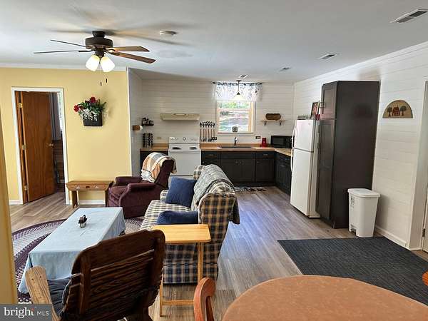 - Ceiling Fan(s), Combination Kitchen/Living, Open Floor Plan, Pellet Stove, Walk-In Shower Bathroom, Wood Floors