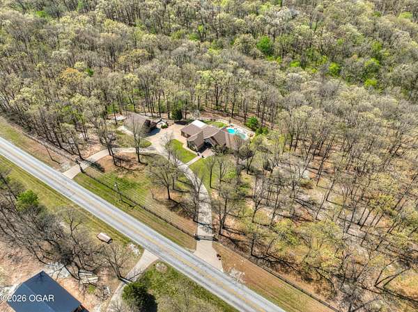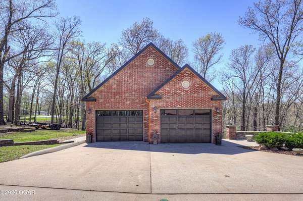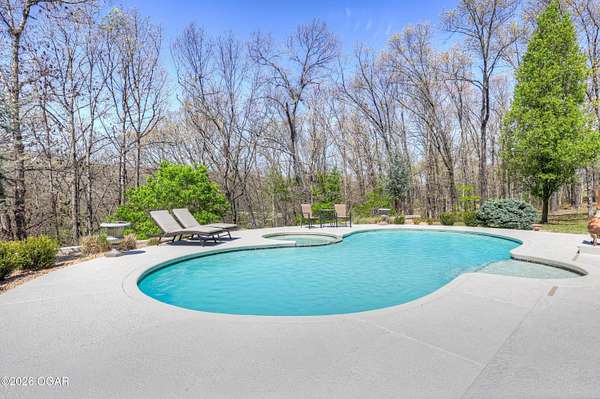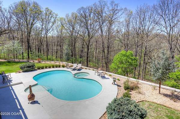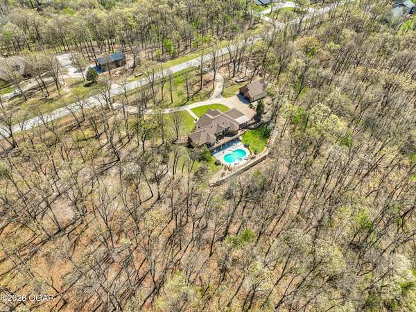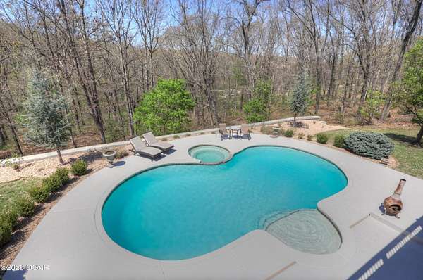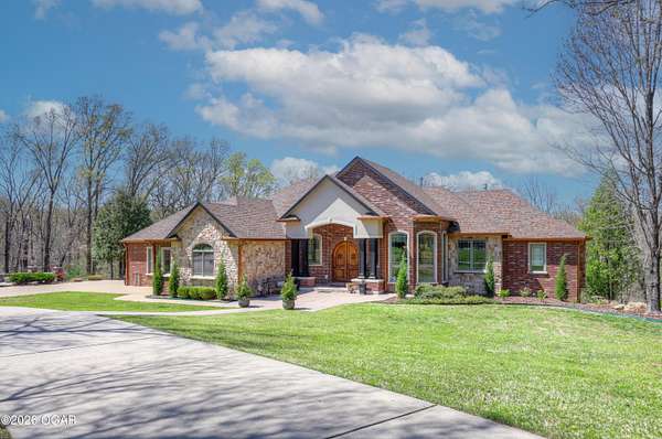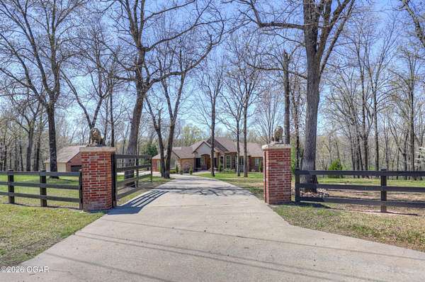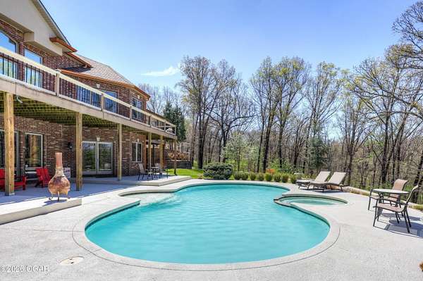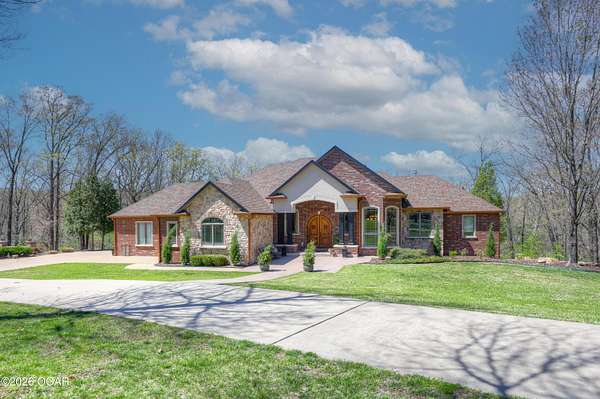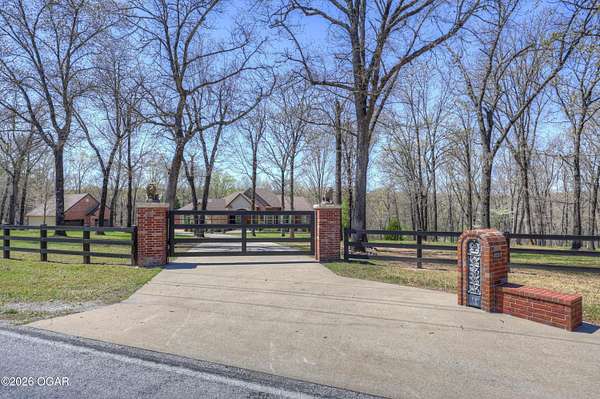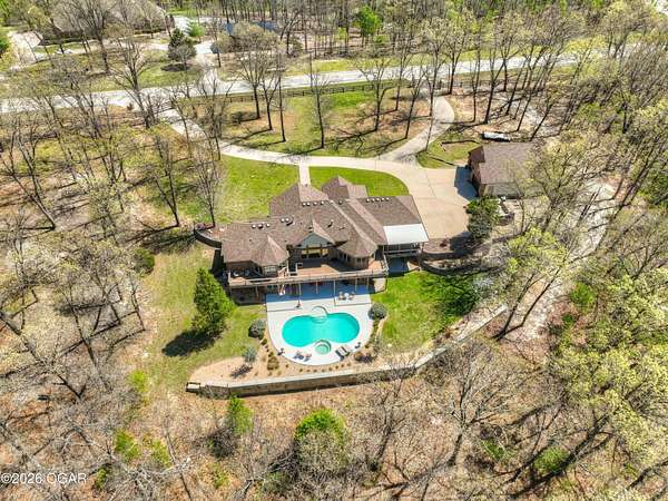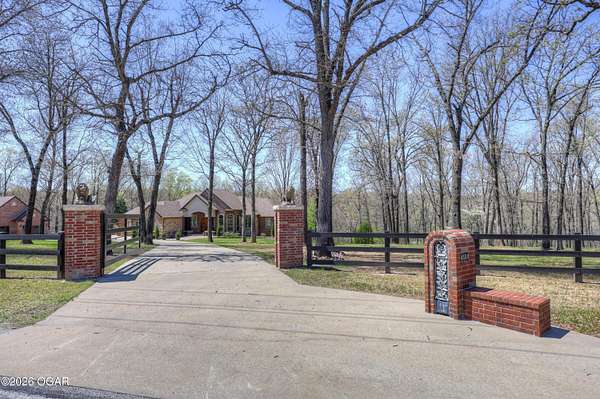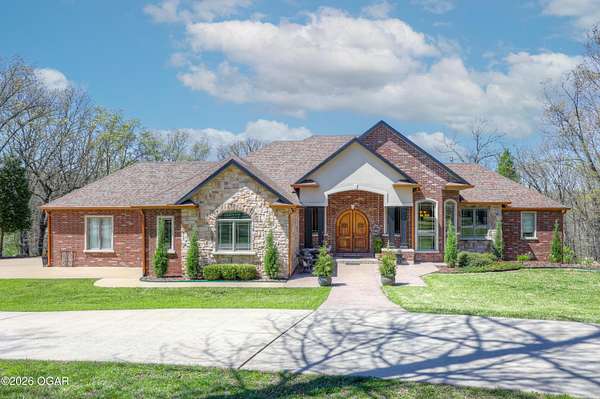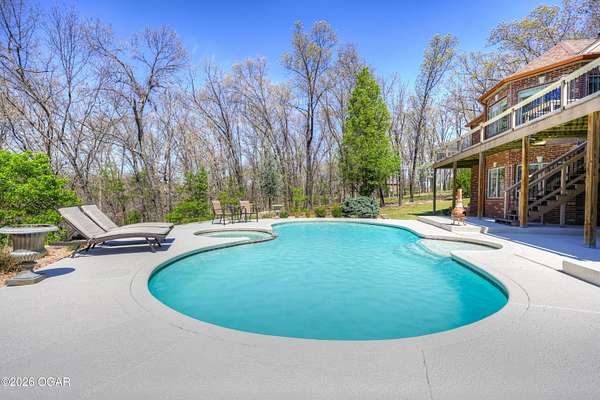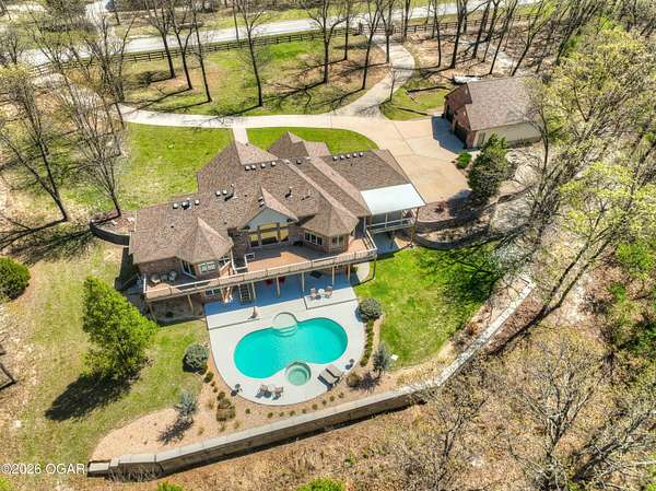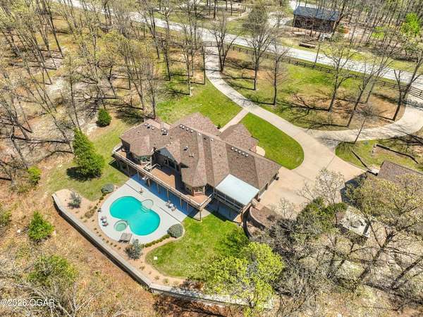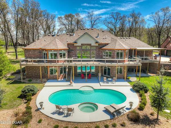 Luxury custom-built estate in south Joplin, conveniently located less than six miles from Freeman and Mercy Hospitals. Tucked behind a gated entrance and surrounded by acres of mature trees, this property offers the kind of privacy and setting that's hard to find. Situated on just over five acres, you'll enjoy a detached 30x40 workshop, a beautiful in-ground pool with cool decking, and plenty of space to spread out and relax. Inside, the craftsmanship immediately stands out with stunning woodwork and crown molding throughout. Large picture windows frame peaceful views of the property. The kitchen and hearth room create a warm, inviting space that's perfect for gathering with family and friends. The primary suite is a true retreat, featuring a double-sided fireplace and an adjoining room ideal for a reading nook, nursery, or private office. The walk-out basement expands your living space with three bedrooms (one non-conforming), a spacious family room, game area, and a kitchenette complete with a walk-in wine cellar and kegerator. Step outside to the patio and enjoy relaxing in your beautiful pool with an abundance of privacy. Numerous upgrades have been completed within the past year--see attached documents for a full list of improvements and amenities. Schedule your private showing and experience this exceptional home for yourself.