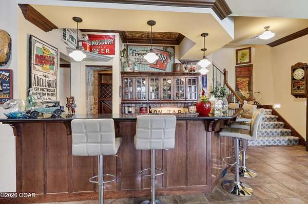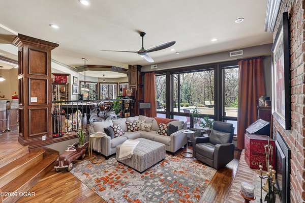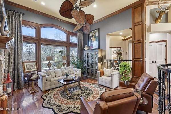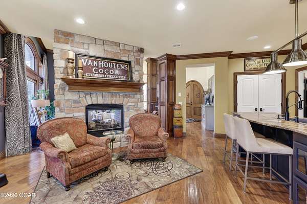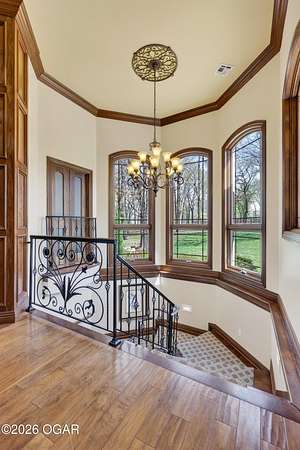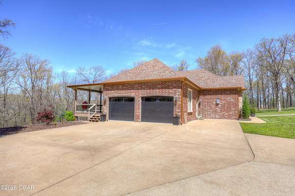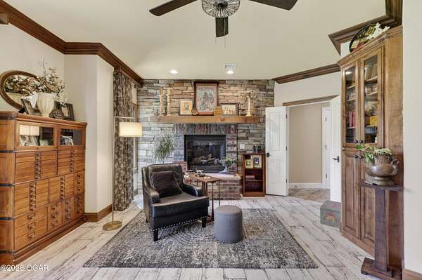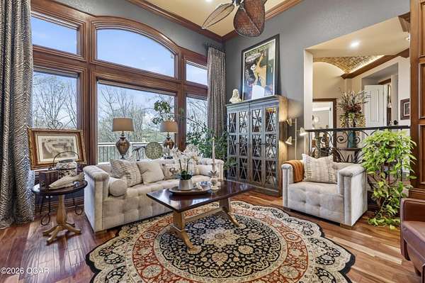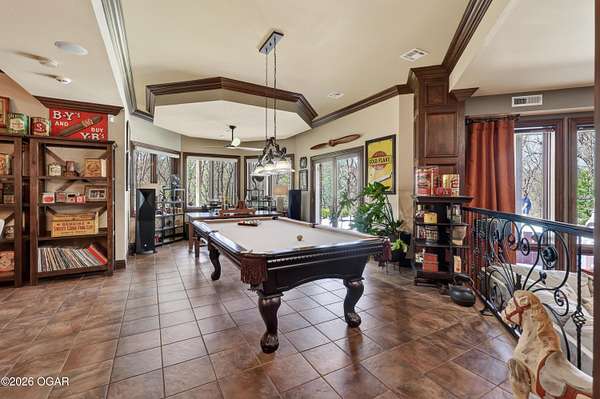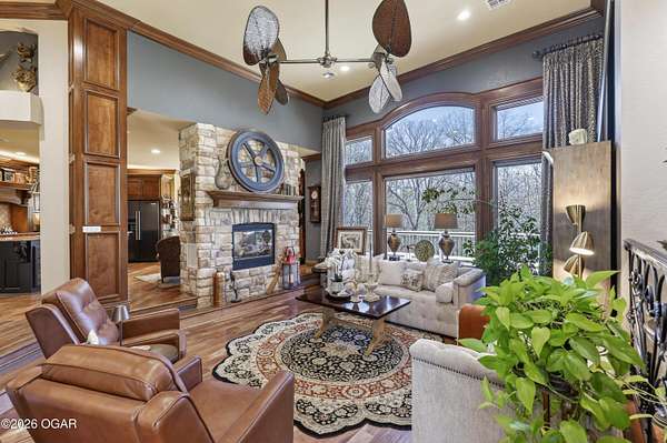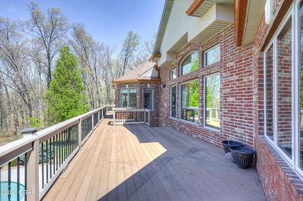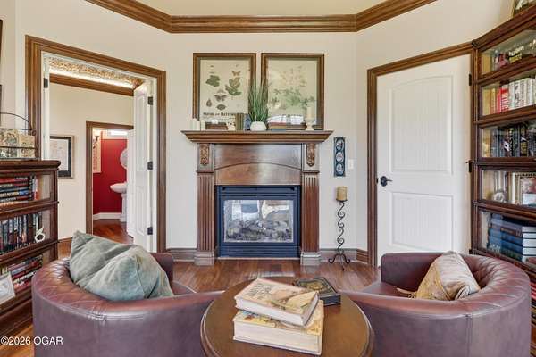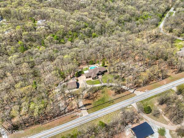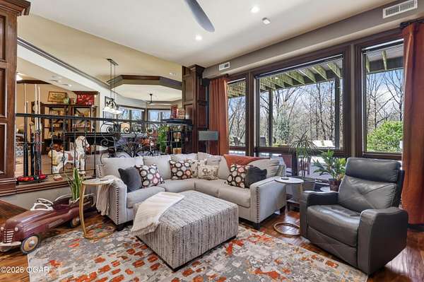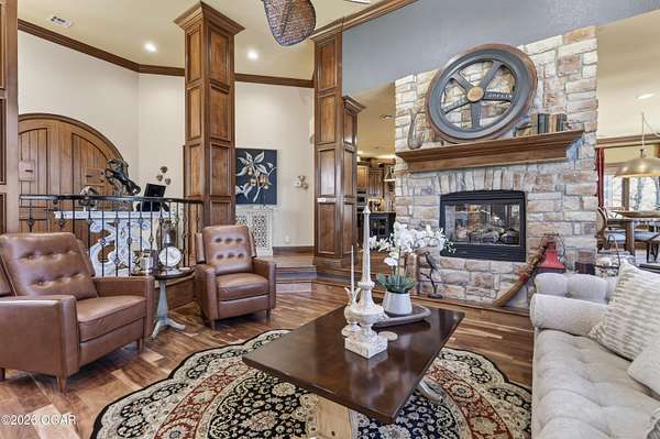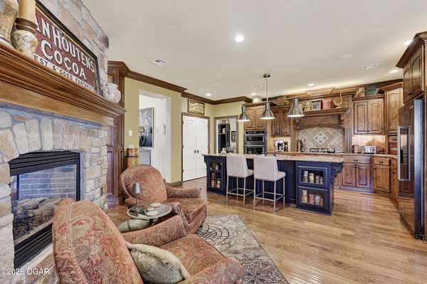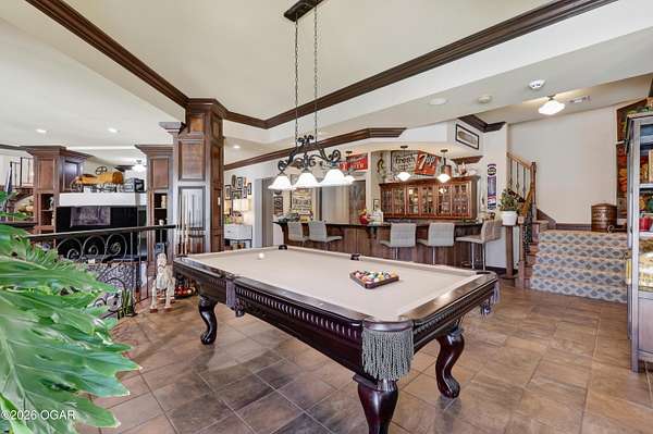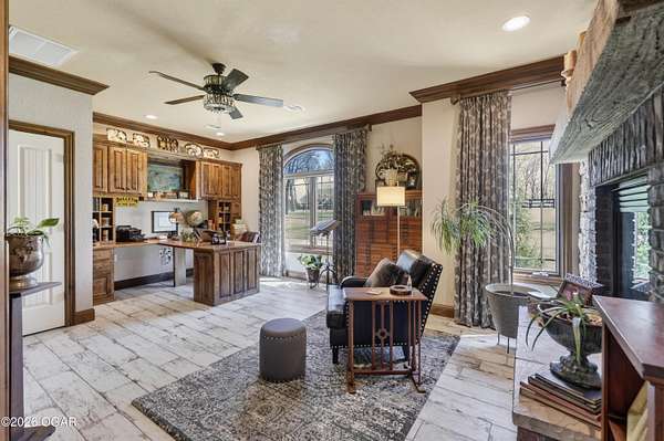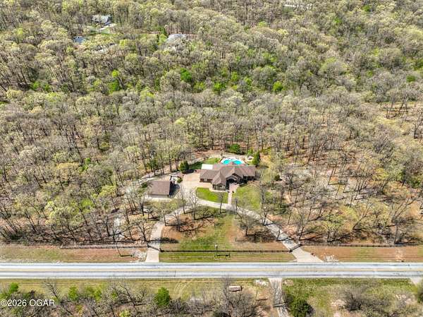 Luxury custom-built estate in south Joplin, conveniently located less than six miles from Freeman and Mercy Hospitals. Tucked behind a gated entrance and surrounded by acres of mature trees, this property offers the kind of privacy and setting that's hard to find. Situated on just over five acres, you'll enjoy a detached 30x40 workshop, a beautiful in-ground pool with cool decking, and plenty of space to spread out and relax. Inside, the craftsmanship immediately stands out with stunning woodwork and crown molding throughout. Large picture windows frame peaceful views of the property. The kitchen and hearth room create a warm, inviting space that's perfect for gathering with family and friends. The primary suite is a true retreat, featuring a double-sided fireplace and an adjoining room ideal for a reading nook, nursery, or private office. The walk-out basement expands your living space with three bedrooms (one non-conforming), a spacious family room, game area, and a kitchenette complete with a walk-in wine cellar and kegerator. Step outside to the patio and enjoy relaxing in your beautiful pool with an abundance of privacy. Numerous upgrades have been completed within the past year--see attached documents for a full list of improvements and amenities. Schedule your private showing and experience this exceptional home for yourself.