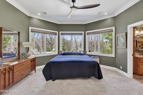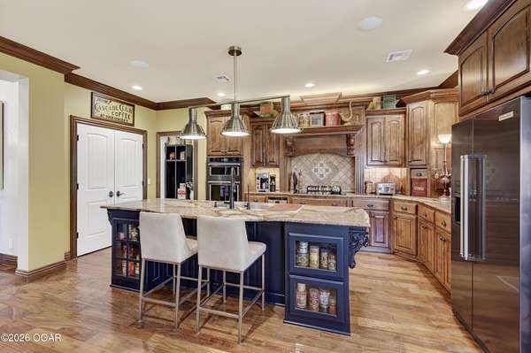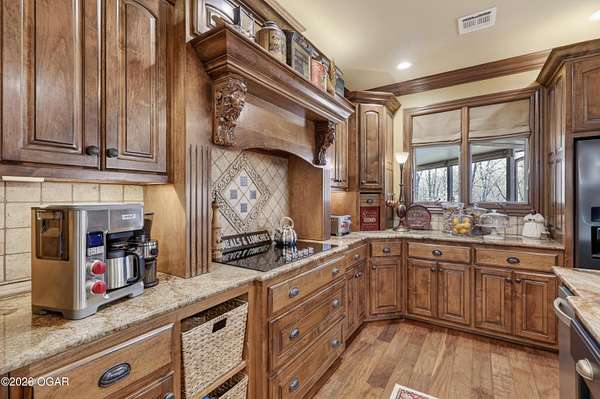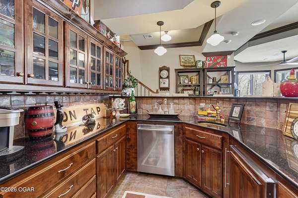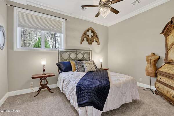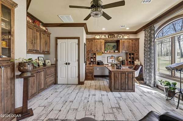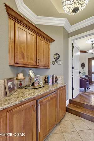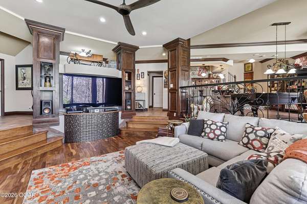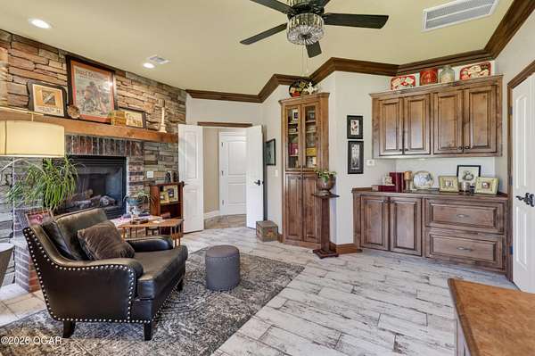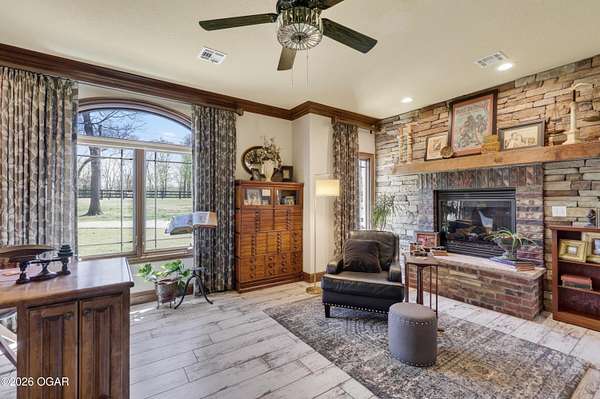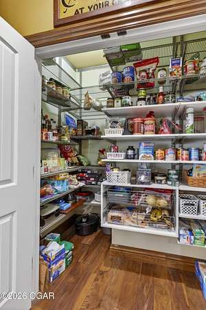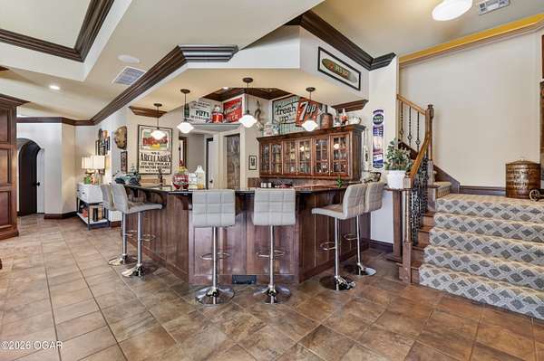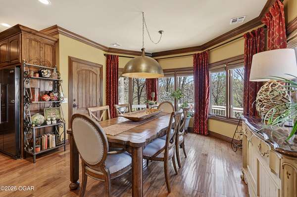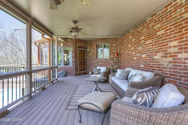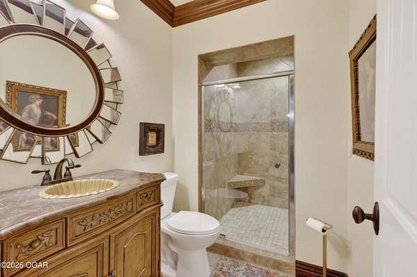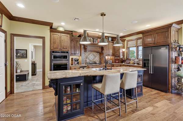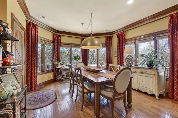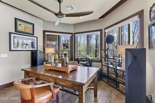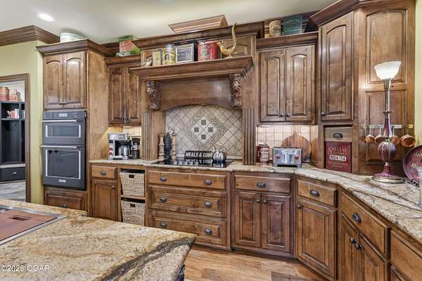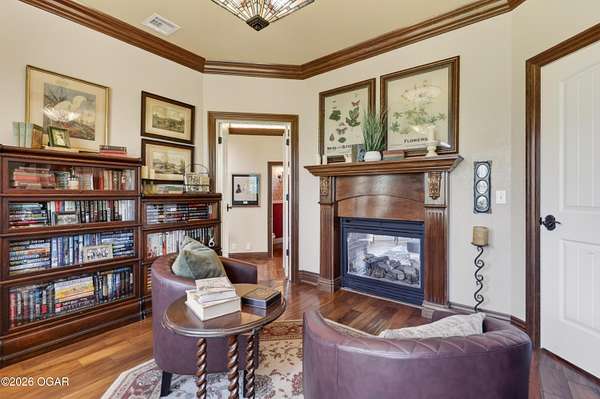 Luxury custom-built estate in south Joplin, conveniently located less than six miles from Freeman and Mercy Hospitals. Tucked behind a gated entrance and surrounded by acres of mature trees, this property offers the kind of privacy and setting that's hard to find. Situated on just over five acres, you'll enjoy a detached 30x40 workshop, a beautiful in-ground pool with cool decking, and plenty of space to spread out and relax. Inside, the craftsmanship immediately stands out with stunning woodwork and crown molding throughout. Large picture windows frame peaceful views of the property. The kitchen and hearth room create a warm, inviting space that's perfect for gathering with family and friends. The primary suite is a true retreat, featuring a double-sided fireplace and an adjoining room ideal for a reading nook, nursery, or private office. The walk-out basement expands your living space with three bedrooms (one non-conforming), a spacious family room, game area, and a kitchenette complete with a walk-in wine cellar and kegerator. Step outside to the patio and enjoy relaxing in your beautiful pool with an abundance of privacy. Numerous upgrades have been completed within the past year--see attached documents for a full list of improvements and amenities. Schedule your private showing and experience this exceptional home for yourself.
