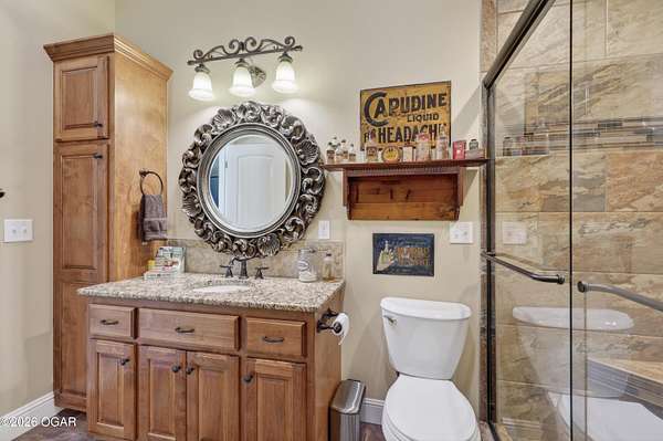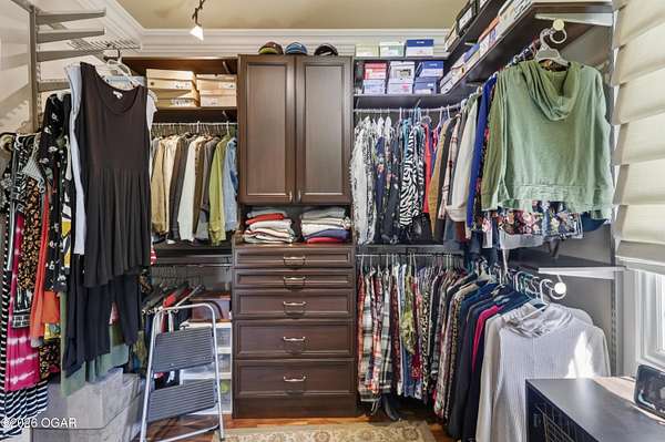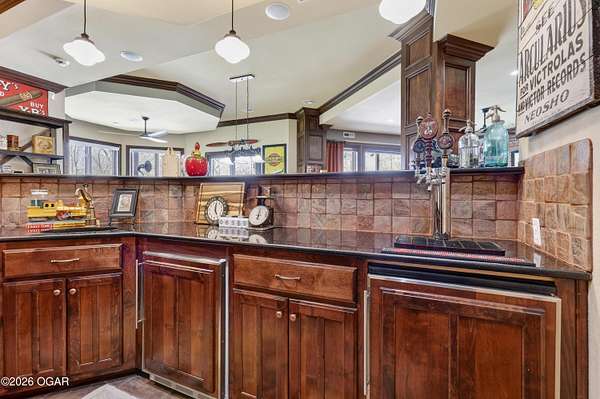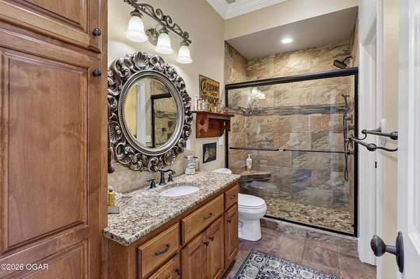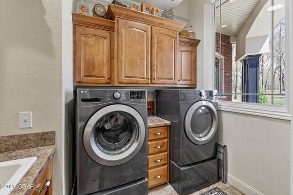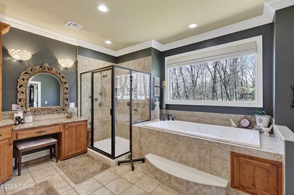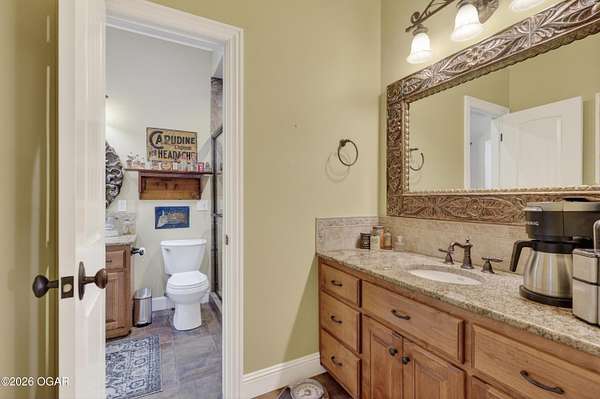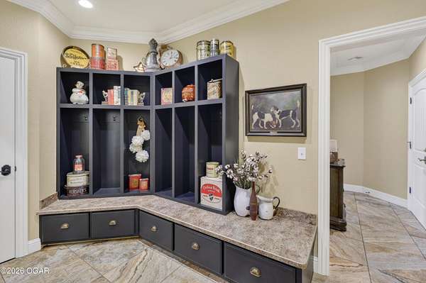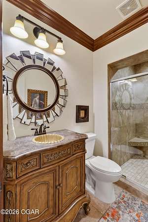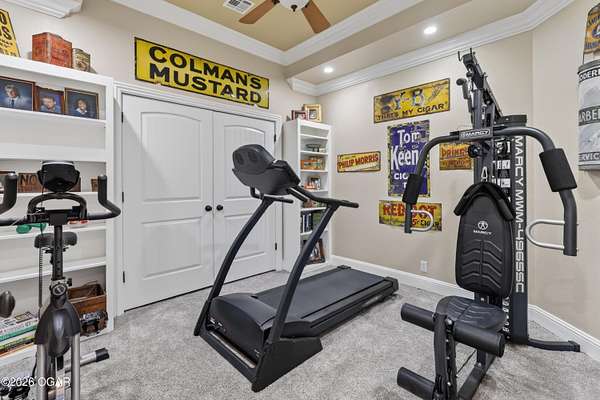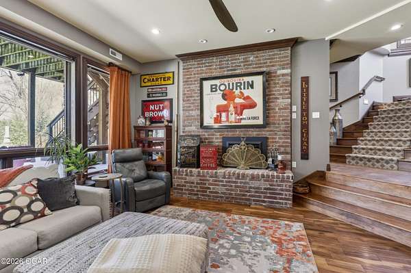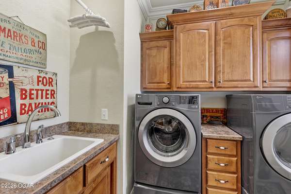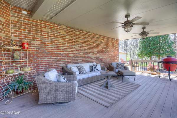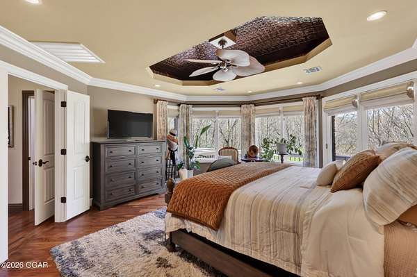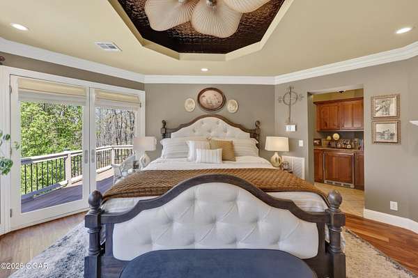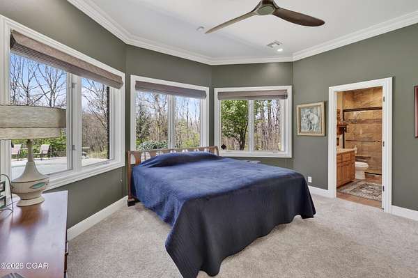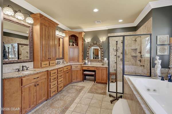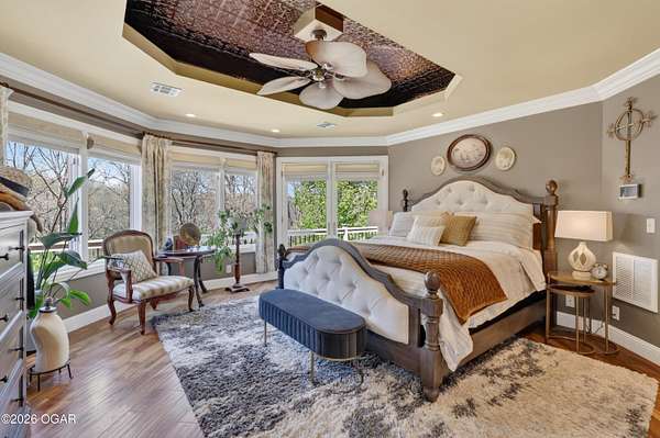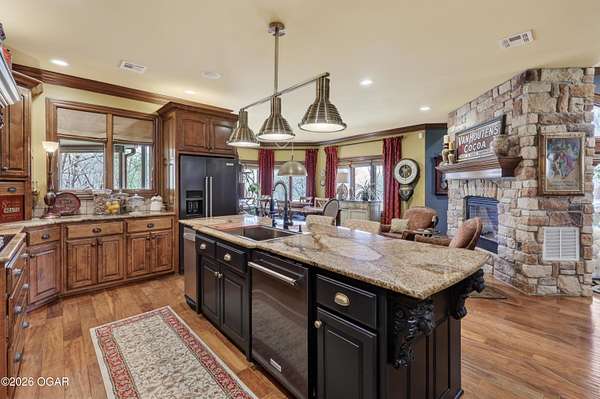 Luxury custom-built estate in south Joplin, conveniently located less than six miles from Freeman and Mercy Hospitals. Tucked behind a gated entrance and surrounded by acres of mature trees, this property offers the kind of privacy and setting that's hard to find. Situated on just over five acres, you'll enjoy a detached 30x40 workshop, a beautiful in-ground pool with cool decking, and plenty of space to spread out and relax. Inside, the craftsmanship immediately stands out with stunning woodwork and crown molding throughout. Large picture windows frame peaceful views of the property. The kitchen and hearth room create a warm, inviting space that's perfect for gathering with family and friends. The primary suite is a true retreat, featuring a double-sided fireplace and an adjoining room ideal for a reading nook, nursery, or private office. The walk-out basement expands your living space with three bedrooms (one non-conforming), a spacious family room, game area, and a kitchenette complete with a walk-in wine cellar and kegerator. Step outside to the patio and enjoy relaxing in your beautiful pool with an abundance of privacy. Numerous upgrades have been completed within the past year--see attached documents for a full list of improvements and amenities. Schedule your private showing and experience this exceptional home for yourself.