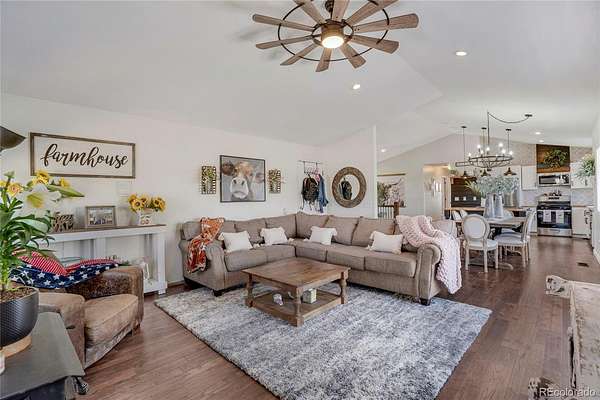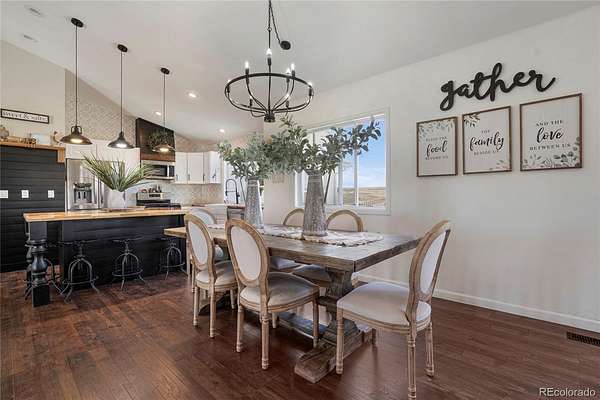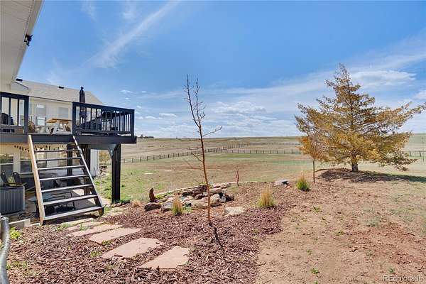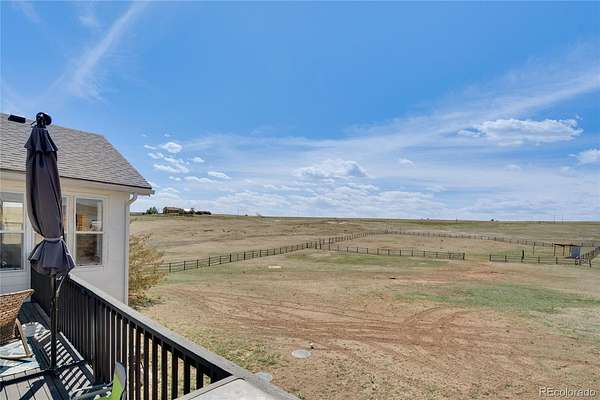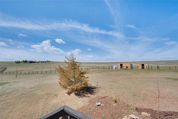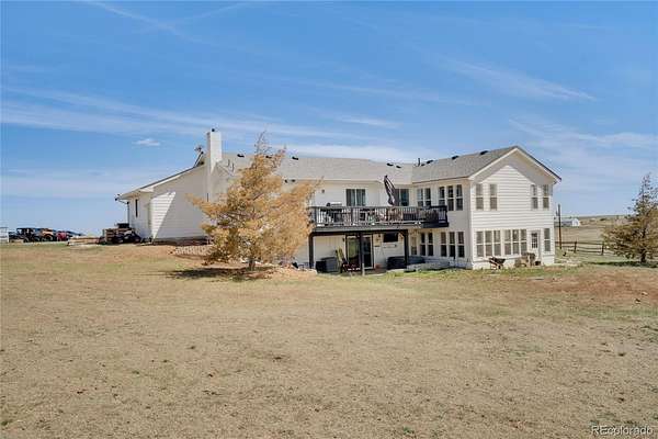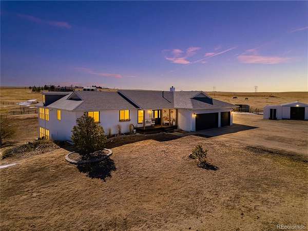 Whether you're dreaming of homesteading, raising animals or simply enjoying wide open spaces, this farm delivers one of the most compelling aspects of prairie living and is revealed after sunset. This location supports darker night skies. With less surrounding light pollution, the stars emerge more clearly and remain visible longer into the evening. This is a subtle but meaningful reason to choose this home in Elbert County. Nestled on 35 beautiful fenced acres of prairie living and serene countryside, this updated farm offers the perfect blend of rustic charm and modern convenience. This property features two spacious outbuildings, one outfitted with a 498 square foot flex space, a versatile shed with stalls, 2 loafing sheds, chicken coop and two wells for ample water access. AG well has an abundance of water! A brand new septic system and leach field offer peace of mind and efficiency. Inside the home, you'll find a stunning newly constructed primary bedroom and ensuite with ample duel closet storage and a sitting room-all designed with comfort and style in mind. The entire kitchen has been renovated with new cabinets a beautiful island and all new appliances. Living room has a cozy stove and opens to the deck for sunset views. Fully finished walk out basement features a great room, bar, 2 bedrooms and a sunroom. Every corner has been thoughtfully updated making this property truly move-in ready.