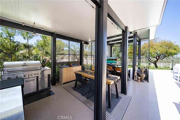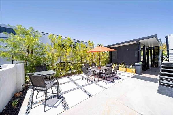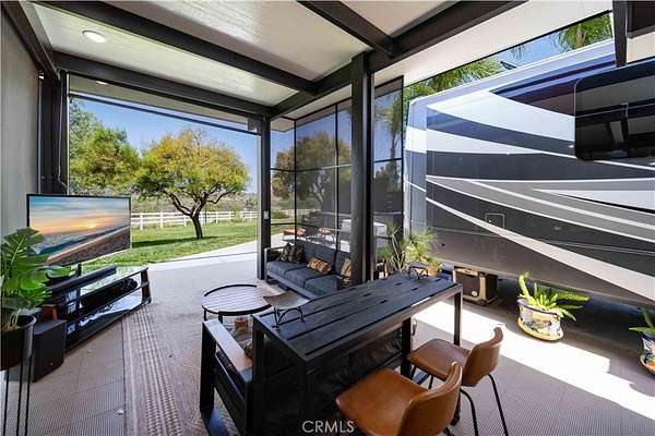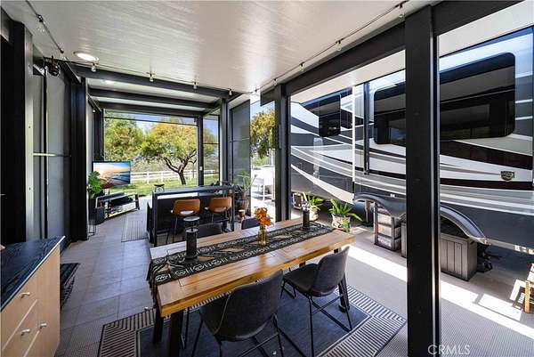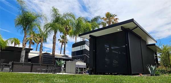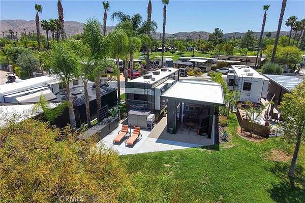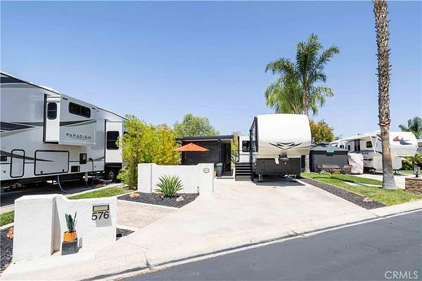Welcome Lot #576 - "The Safari Lodge", located in the highly sought after, spectacular sunset view section of the RCRVR 500s. This property is a new Black & White Mid-Century Modern style Alumawood buildout, with a layout for entertaining and paved golf cart parking! The patio buildout is a double roof line tilted Mid-Century style with recessed lighting, an upgraded insulated roof, rain gutters, bistro lighting in the BBQ & covered dining area, and ceiling beams in the living room! There is seating for 19-people...this includes 2-dining tables, bar counter & seating, and a counter height bistro table for two! There is also a private area at the rear of the lot with 2-chaise loungers for catching the many sunset views at that Golden Time of Day. This modern and unique lot includes custom planter boxes with drought tolerant plants, a raised floating floor that keeps the stylistically appointed area rugs dry, and custom canvas shades. In the large courtyard area, you will find 30" custom concrete pavers and black Mexican beach pebbles, solar accent lighting, and tall privacy trees lining the side of the courtyard. The property includes plenty of storage, decorative artificial plants, and 2-security cameras with motion, night vision, and app for self-monitoring your lovely property. The sides of "The Safari Lodge" are landscaped in black lava rock and lovely drought tolerant plants. The quiet Bath-house #5, pool, & laundry, only 4 sites away.