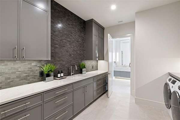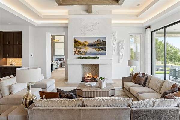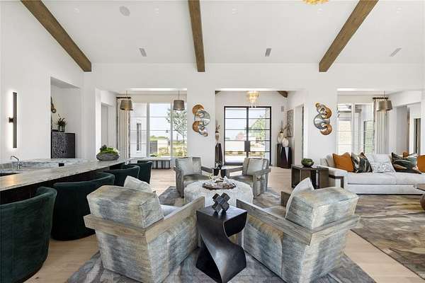 Designed for effortless living and entertaining, the open-concept living room flows into the dining area and chef's kitchen--complete with a central island, a spacious back kitchen, and a separate walk-in pantry. The great room features a stylish wet bar, while a dedicated study offers a quiet space to work or unwind. A separate lounge with its own wet bar opens directly to the back patio, creating seamless indoor-outdoor living.