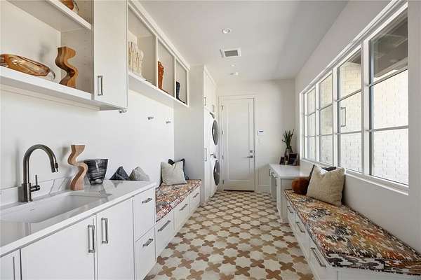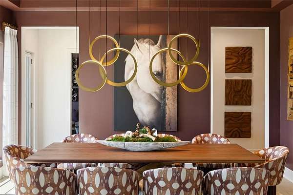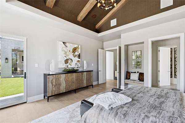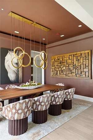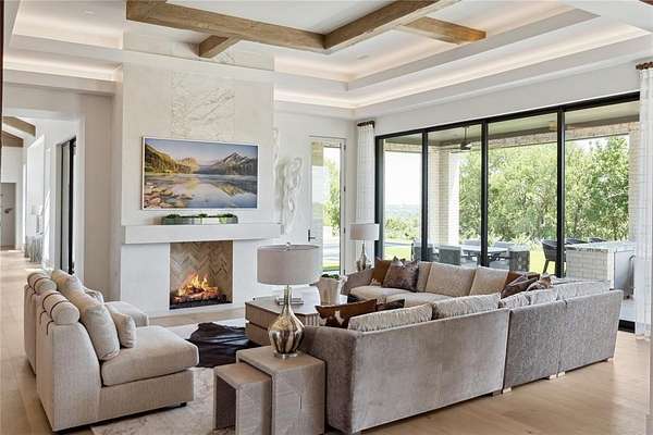 Architectural details include rustic stonework and distressed wood accents with a modern twist. The home's clean exterior lines, metal accents, and limewashed finishes lend a timeless character, while the interior embraces soft greens, earth tones, and vineyard-themed color palettes--chardonnay, merlot, and cognac--infusing every space with a sense of warmth and lived-in luxury.