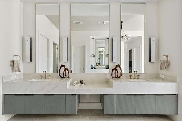Spanning a thoughtfully designed layout, the home features 4 bedrooms, 4 full and 2 half bathrooms, and a 3-car garage with additional motor court parking. The primary suite offers a true retreat with its own private patio, sitting area, dual closets, a safe room, separate vanities, a freestanding tub and walk-in shower, coffee bar, and a connected laundry room. Each of the three additional bedrooms includes ensuite baths and custom walk-in closets.