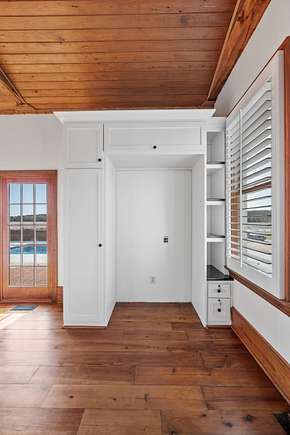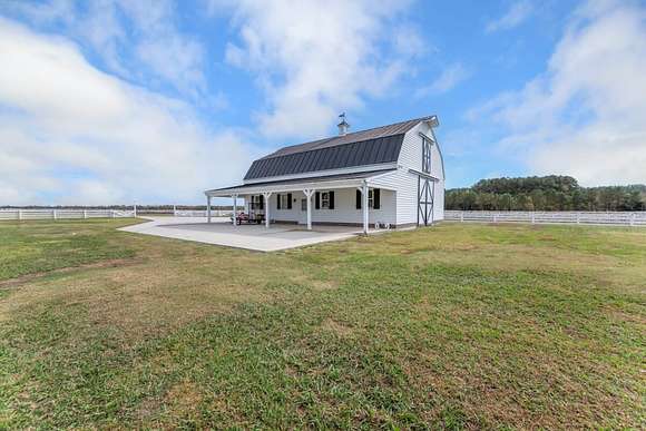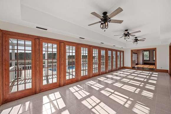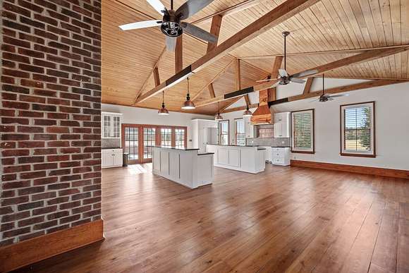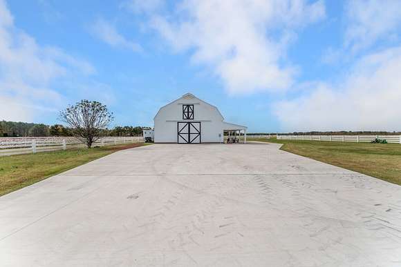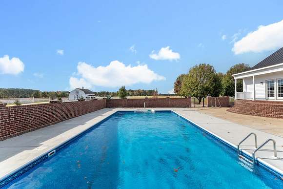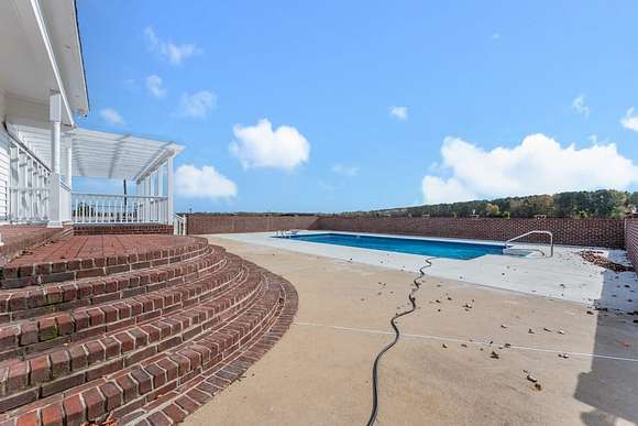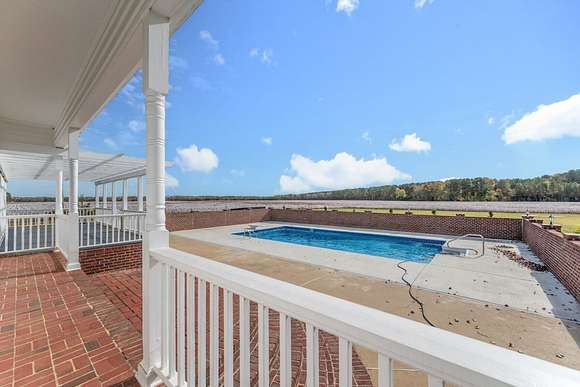 Exterior: Guests are welcomed by impressive brick entrance columns, setting the tone for the elegance that lies within. The estate's timeless appeal makes it an unforgettable venue for weddings and events. The expansive grounds include a sparkling in-ground swimming pool, a charming 1,536 square foot barn with plumbing and electrical, and fenced pastures, ideal for horses or other livestock. A spacious balcony and large deck provide the perfect vantage points to enjoy the serene landscape and host outdoor gatherings.