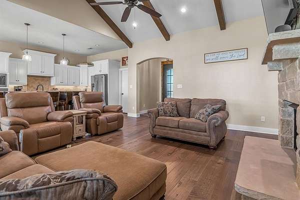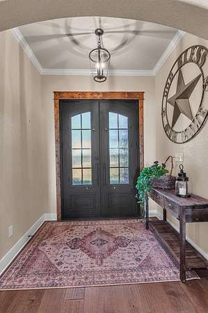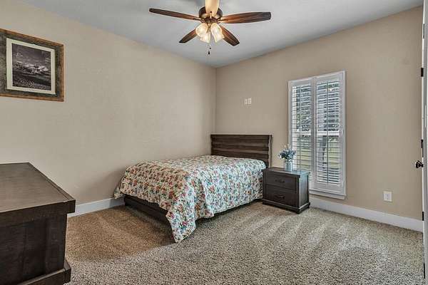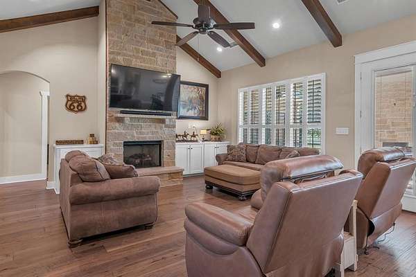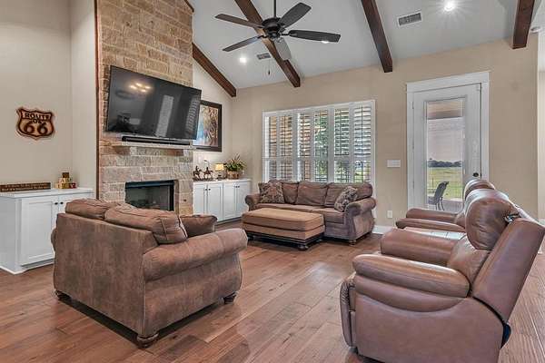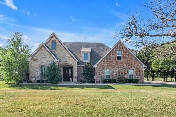 Just outside the city limits of Springtown. Bring your animals and enjoy the countryside!! This beautiful home is situated on 1.8 acres. Entering this home through beautiful steel doors with 4 large bedrooms, 3 full baths and an upstairs secluded Game room with a full bath. It is an open floor plan with split bedrooms. The utility room features a large drying area with sink. The custom kitchen has a walk-in pantry with windows and custom shelving and room for kitchen accessory appliances. The outdoor patio has a wood burning fireplace and there is a sprinkler system with Landscaping, gutters, exterior lighting and a wide Concrete Driveway. This home also has paid off solar panels which allows for a very low or no monthly electricity bill. There is a 20x20 shop with electricity with an attached awning to protect your boat. The attached garage can also be used as a workroom or office as it is heated and cooled.