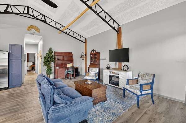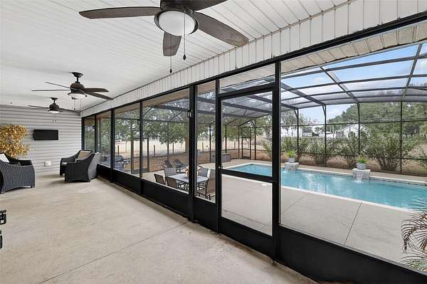 Outdoor living is equally inviting with a covered front porch and large screened rear lanai leading to the enclosed in-ground pool—perfect for year-round Florida enjoyment. Just beyond the pool enclosure, a firepit creates an ideal setting for relaxing evenings under the stars. A pole barn adds versatility for storage, recreation, or agricultural-related use.