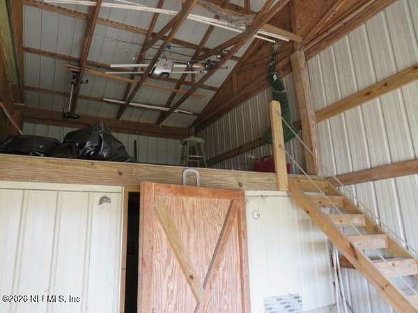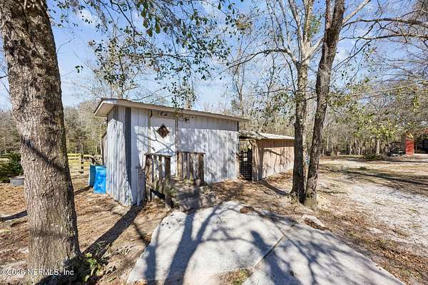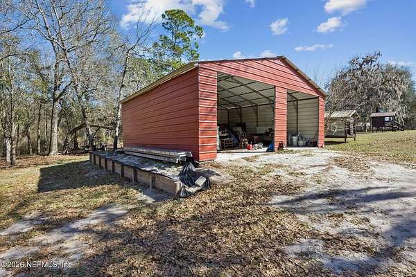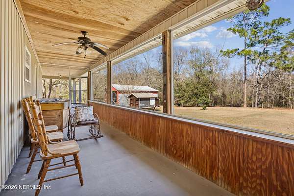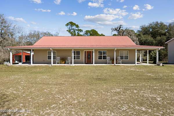 This parcel was owned by 1 family, but divided into 2 parts many years ago. This is 5 acres ''in the back'', that abuts Jennings State Forest. The land behind the house is cleared, but the bulk of the parcel sits left of the house. This is used for hunting, wildlife, deer, birds, trees, creeks...an AMAZING peace of nature!!! ''Neighbors'' on the sides own huge parcels/50 & 80 acres so you have the outdoor life to live!! Upon entering the front gate that shows ''Bar Ranch'' go down a few feet and left turn onto the easement that leads up to this parcel. The house is 1710 SF, built with true pinewood inside & hardiboard outside. A metal roof, wraparound porch w/ screened back porch, central vac system . 3/2 house, laundry room, kitchen open to the living area has lots of space for cooking & entertaining. House built in 2008. There is a pole barn (24x48ft) w/ storage room. 2 car garage. Bring your horses...there's a 4 stall barn and tack room. Property is fenced & cross fenced. This is the dead of winter, no leaves on the decorative trees, brown yard and as agent I can hardly wait for spring to sprung!
