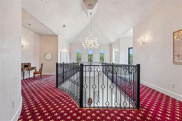 Welcome to your 139+- acre horse ranch, where Italian-inspired elegance meets Texas charm. The estate boasts 14,641 sq ft of living space, including 10 bedrooms, 10 full baths, and 2 half baths across the main house and two attached apartments. Anchored by a 52-foot limestone tower straight out of a fairytale, this property is surrounded by breathtaking rolling pastures and lush landscapes. Inside, over 120+ imported handmade Murano crystal chandeliers and sconces from Italy add a regal touch, while marble floors and ensuite bathrooms elevate each bedroom. The great room is perfect for entertaining, with a chef-inspired kitchen complete with Viking appliances including convection ovens while wall to ceiling windows adorn the space allowing for loads of natural light. Adding to the Italian charm, you'll find a private wine room embedded behind the wet bar at the bottom of the tower tucked away behind one of the many custom wrought iron doors.
