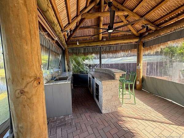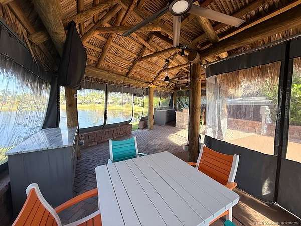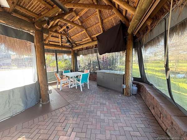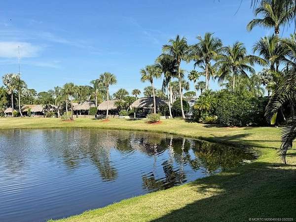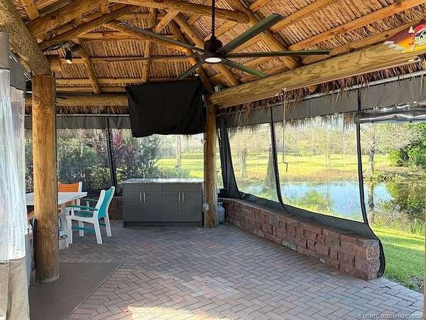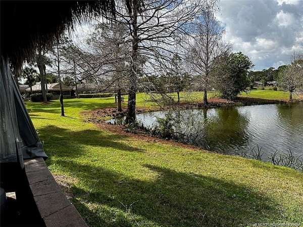 Elevate your lifestyle with this exceptional offering - where view and location converge to create the ultimate living experience. Behold panoramic vistas of the serene lake, adorned with enchanting water fountains, providing a picturesque backdrop for mesmerizing sunsets. Additionally, the breathtaking panorama of the adjacent golf course, ensures a feast for the eyes at every turn. Positioned strategically, this property enjoys unparalleled convenience, directly opposite the clubhouse, pool, hot tub, and tennis court, while also being in close proximity to the delightful doggie park. Delight in the meticulously landscaped surroundings, featuring mature greenery accentuated by charming raised landscape beds and elegant pavers arranged in a timeless herringbone pattern. The large tiki hut offers both entertainment and functional outdoor space and recent enhancements include the new marine grade cabinetry. Fully furnished, this move-in-ready gem promises worry-free outdoor living.